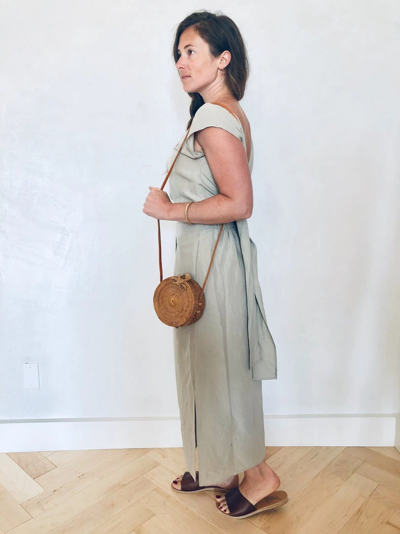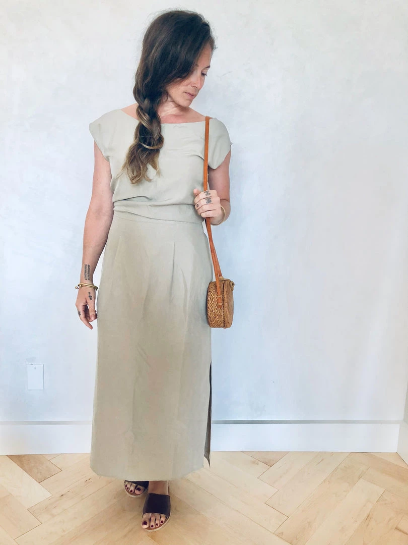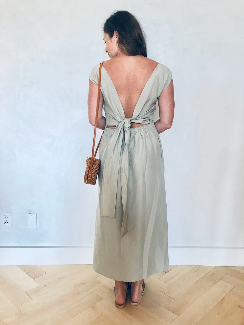 Simple yet elegant dress with two small pleats at front and side openings. Elastic back allows for ease and comfort; tie may be secured loosely in the back or cincheed around to the front for more definition. Hem falls above the ankle.