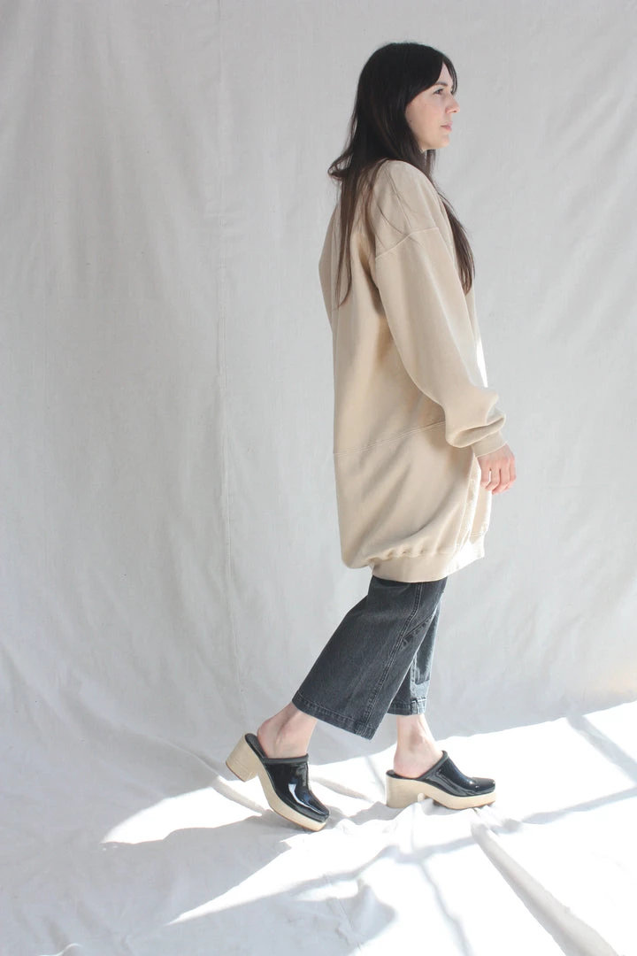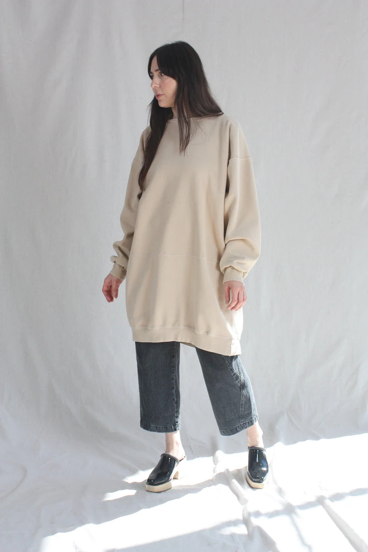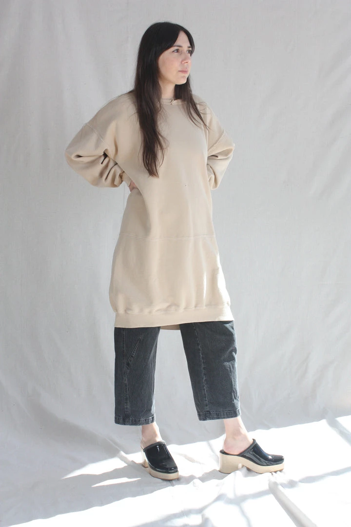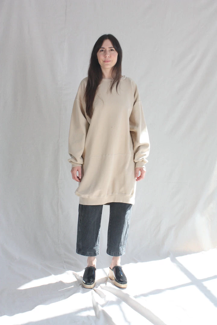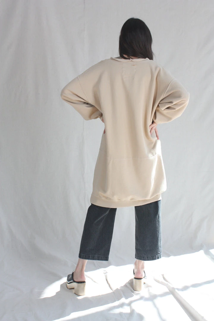 A knee-length dress version of a favorite, vintage-inspired RC sweatshirt, with wide raw-edge neckline, drop shoulders, voluminous sleeves, and unique distressing throughout.