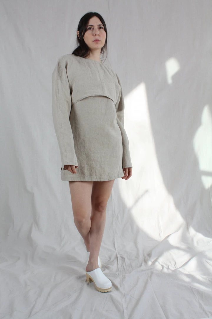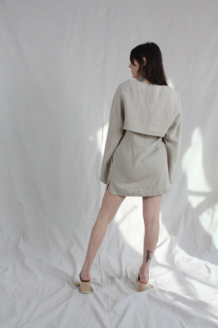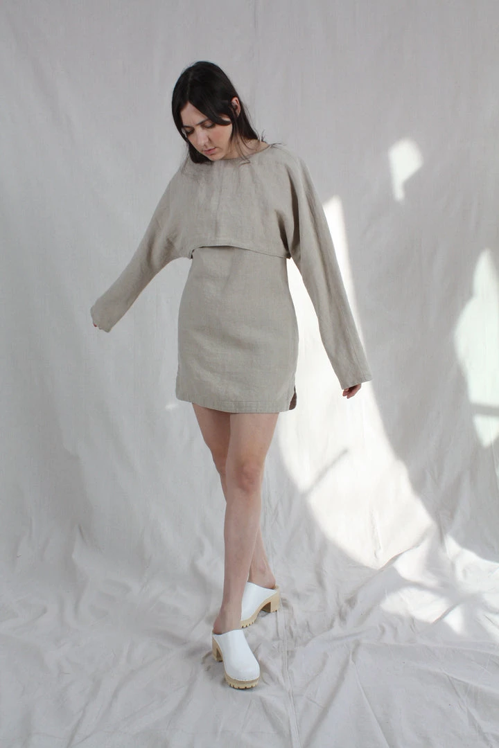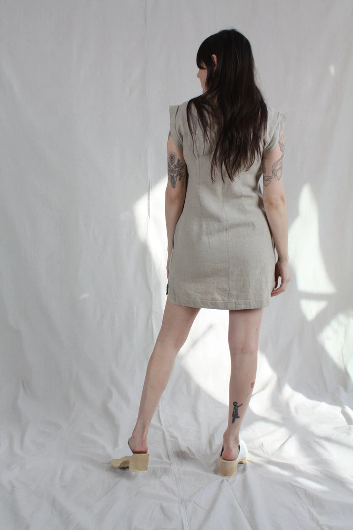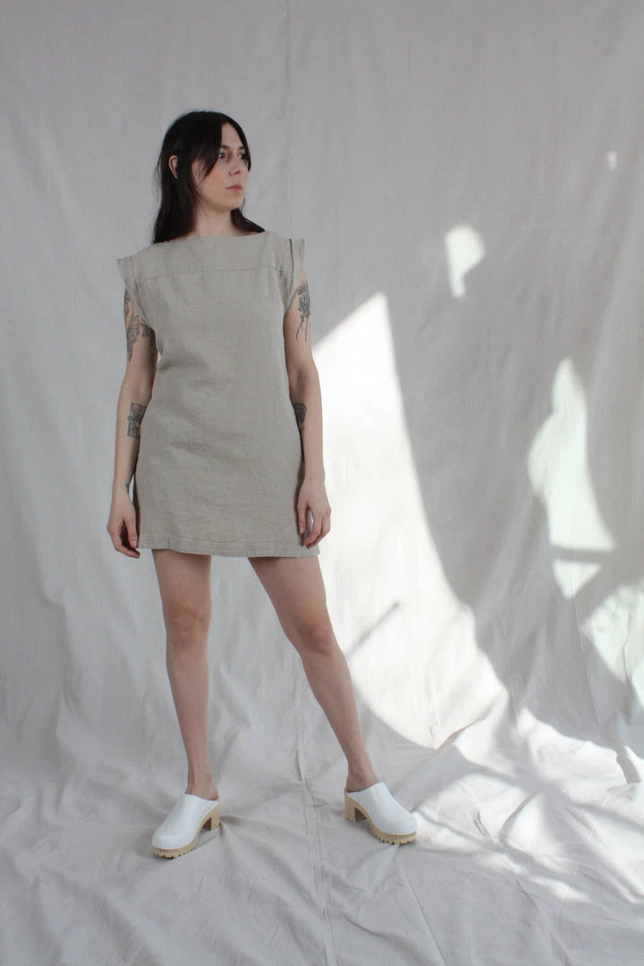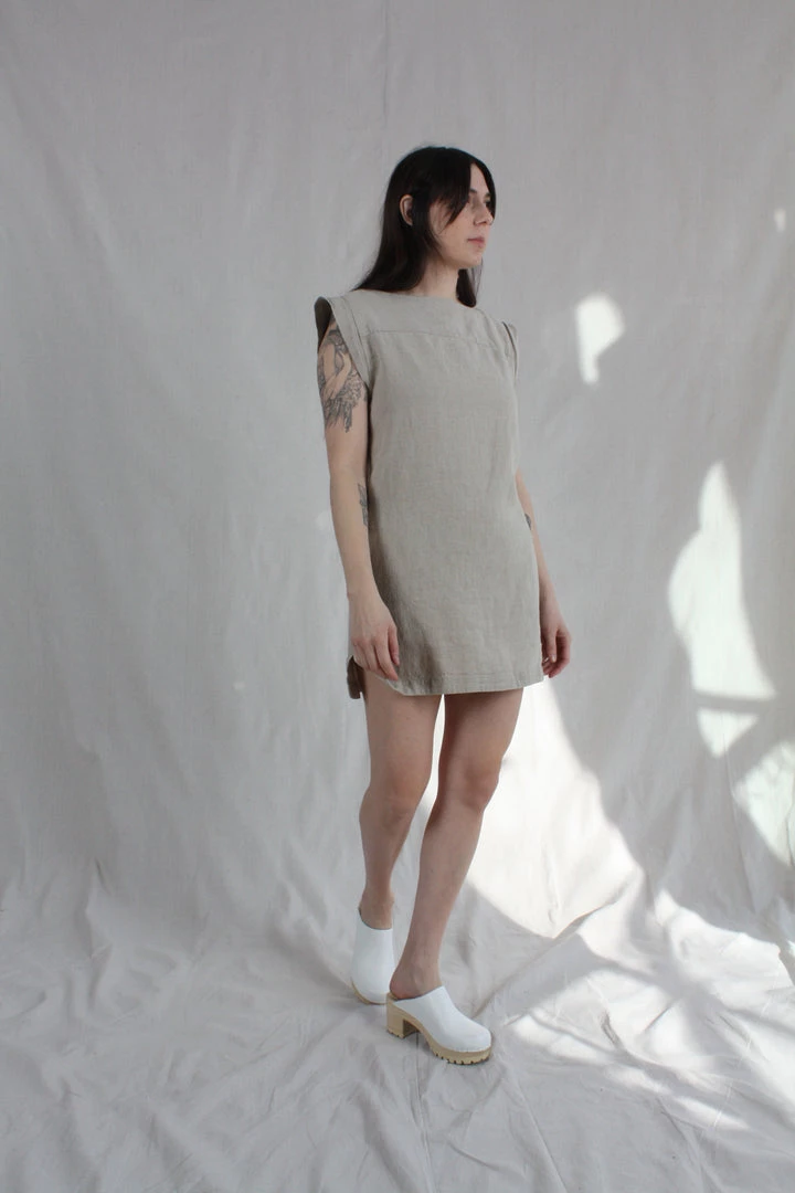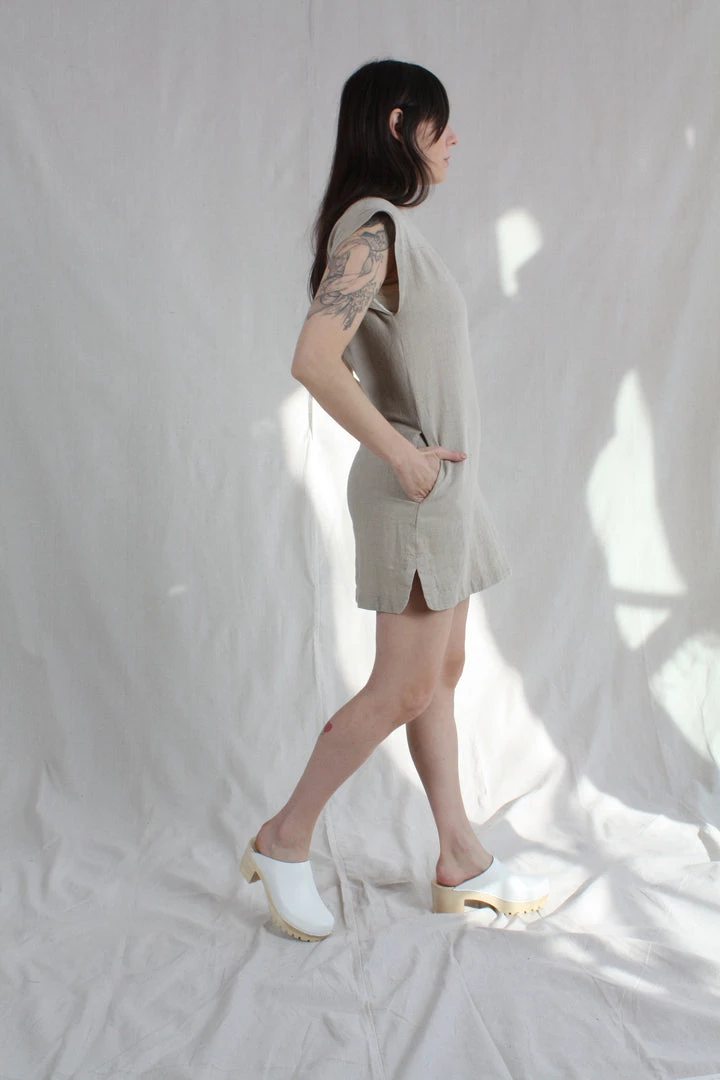The Frankfurt Mini is made in a soft, enzyme washed heavy linen. This mini-dress silhouette features a boatneck, side pockets, and slits at the hem. Relaxed fit. Zipper closure at back.
