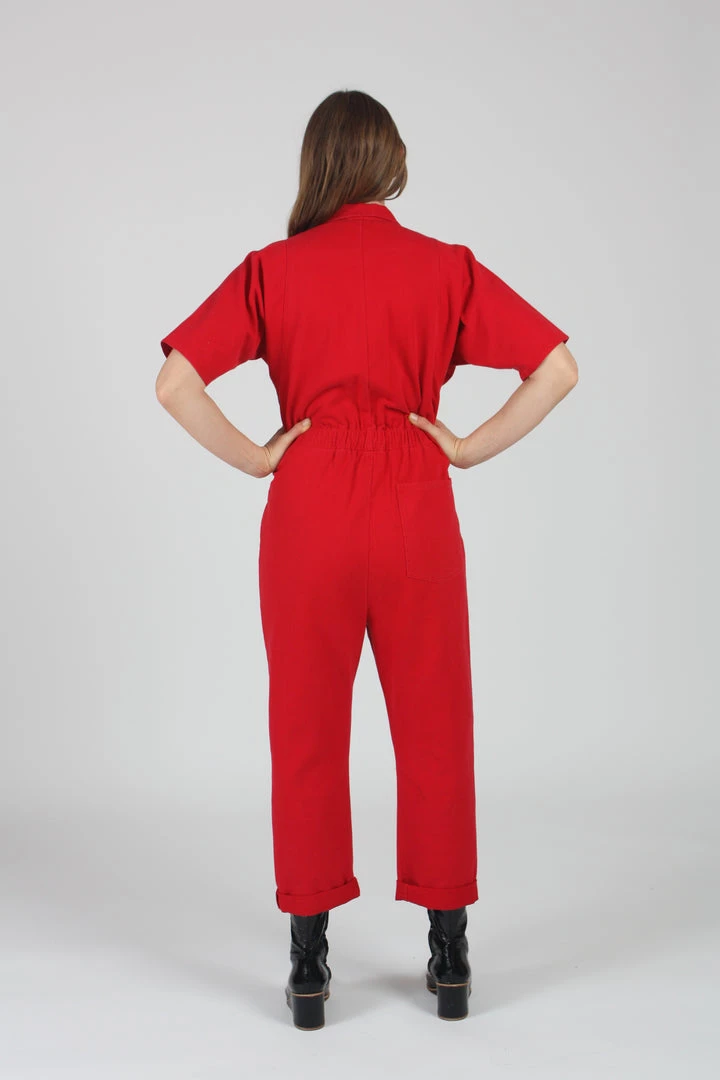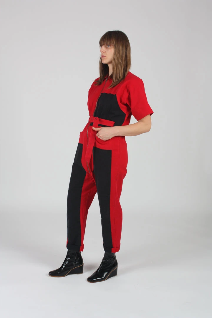 A workwear inspired jumpsuit with color blocking in a bold red and black. It has a slightly boxy cut that can be fitted with a waist tie at the hips. The legs are long and straight with the option to cuff the hem. Easy to jump in and out of with a zipper fly closure along the front. Front zipper closure Belt at the waist. Slash pockets at the hips