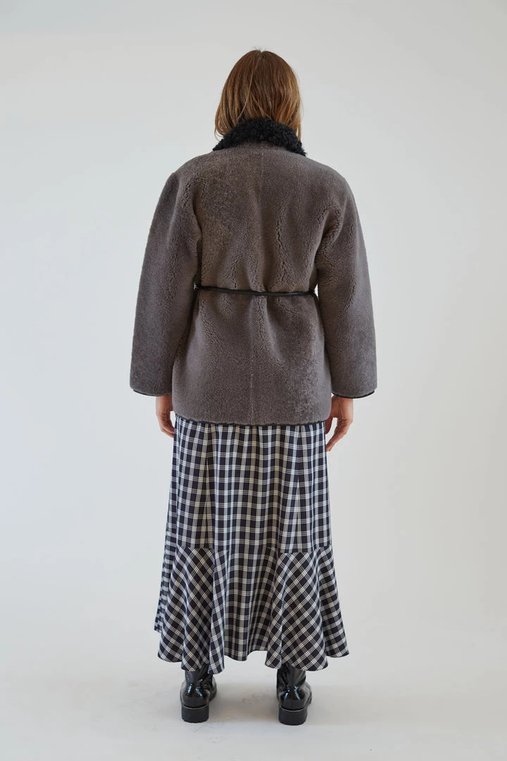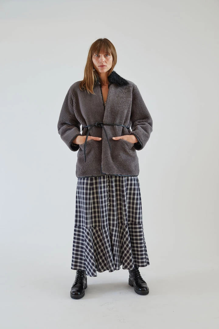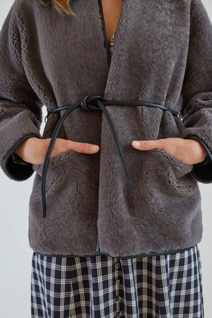 The Herald Coat is a charcoal wrap shearling coat. It has a straight, comfortable fit with and two patch pockets at the hem. The coat wraps around the waist with a leather rope tie. Patch pockets at body hem. Rope tie closure.
