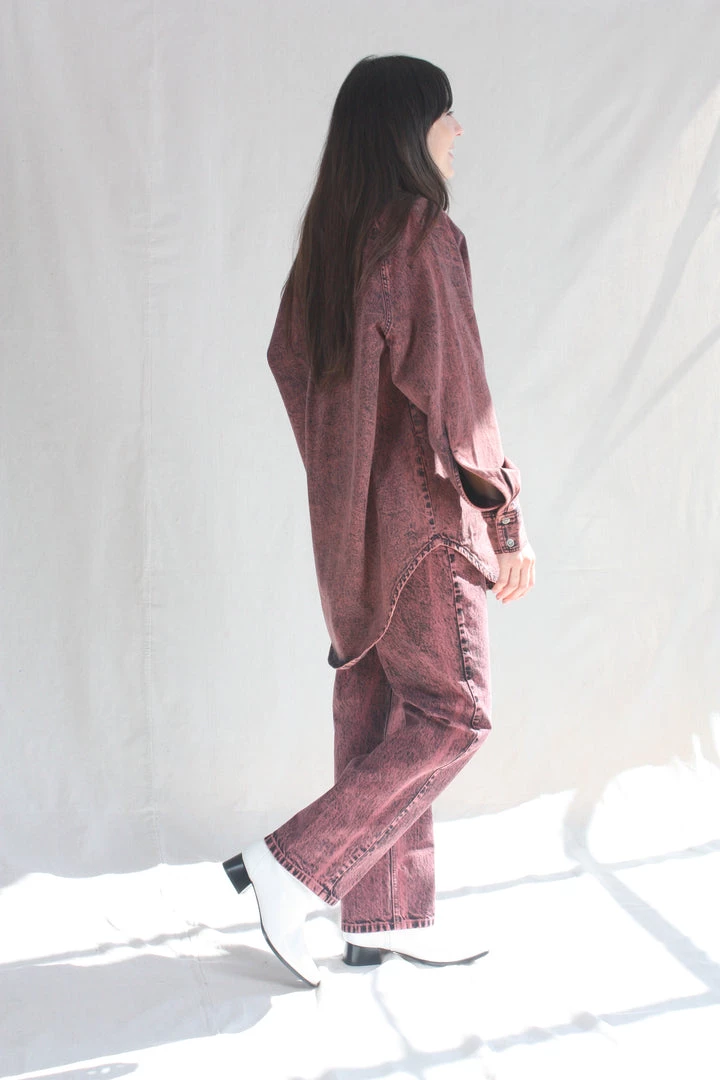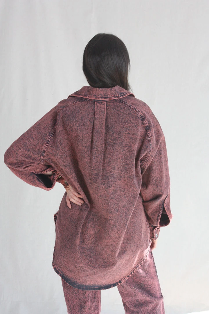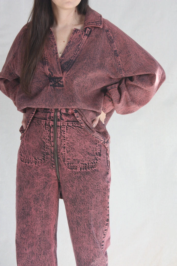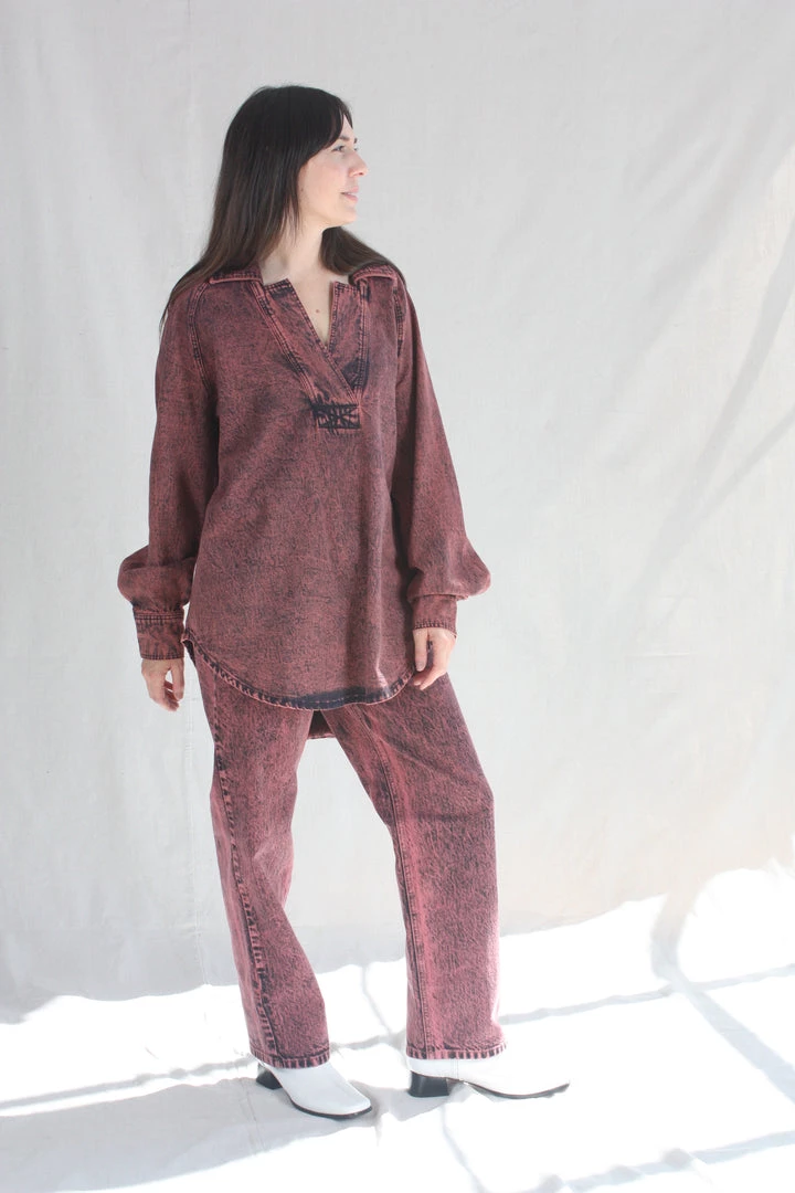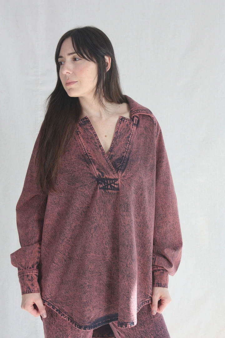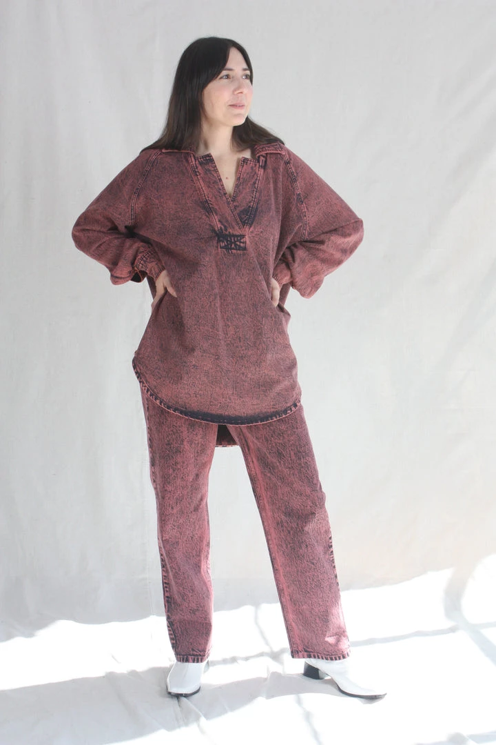 The Isa Polo is a relaxed, popover style with a polo collar in a guava acid wash denim.