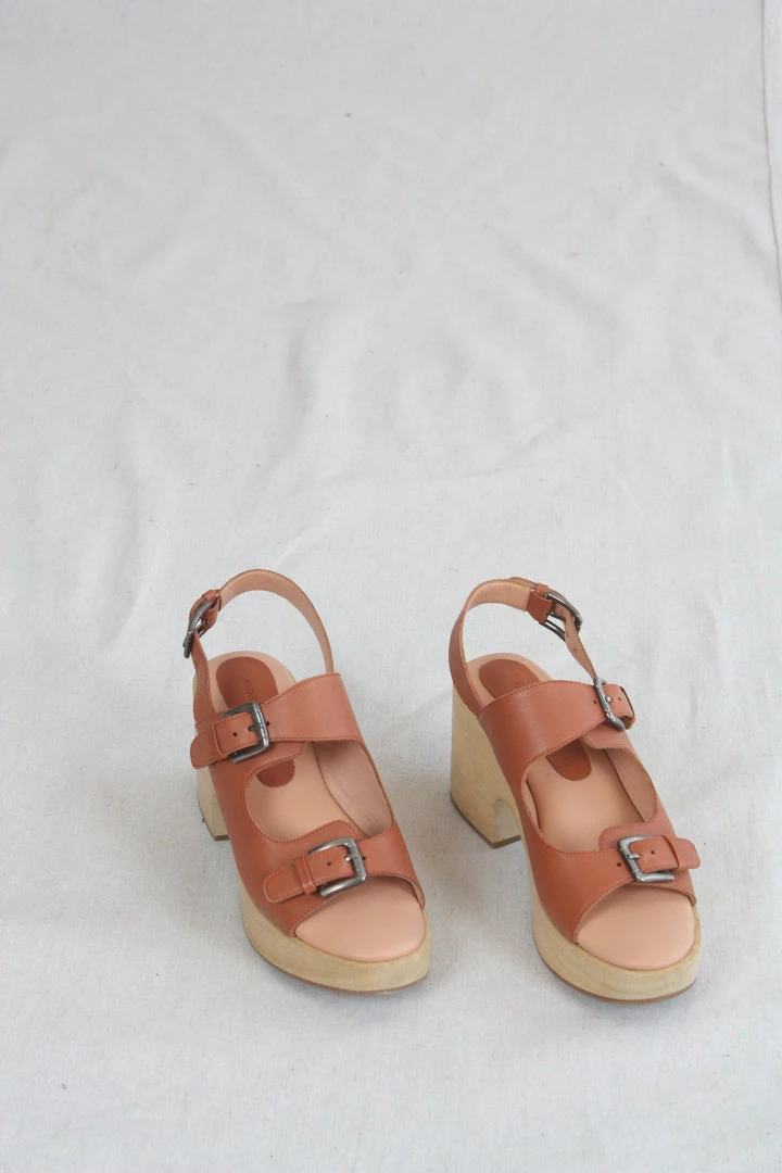Chunky mid-heel triple strap clog sandal, in kidskin leather. Buckle closures.