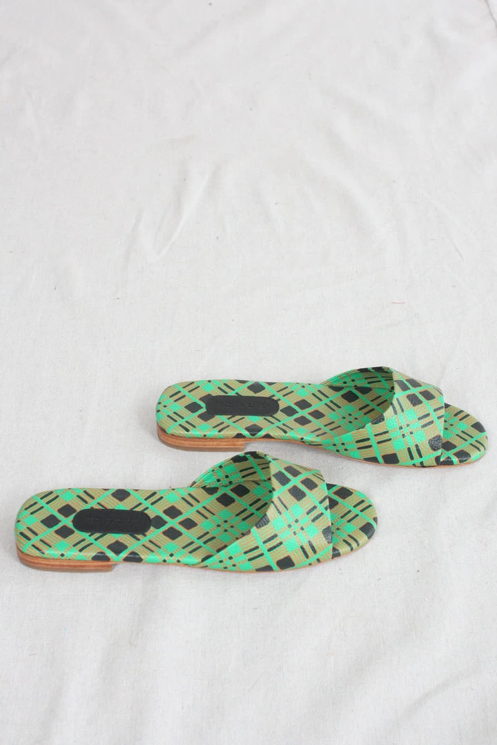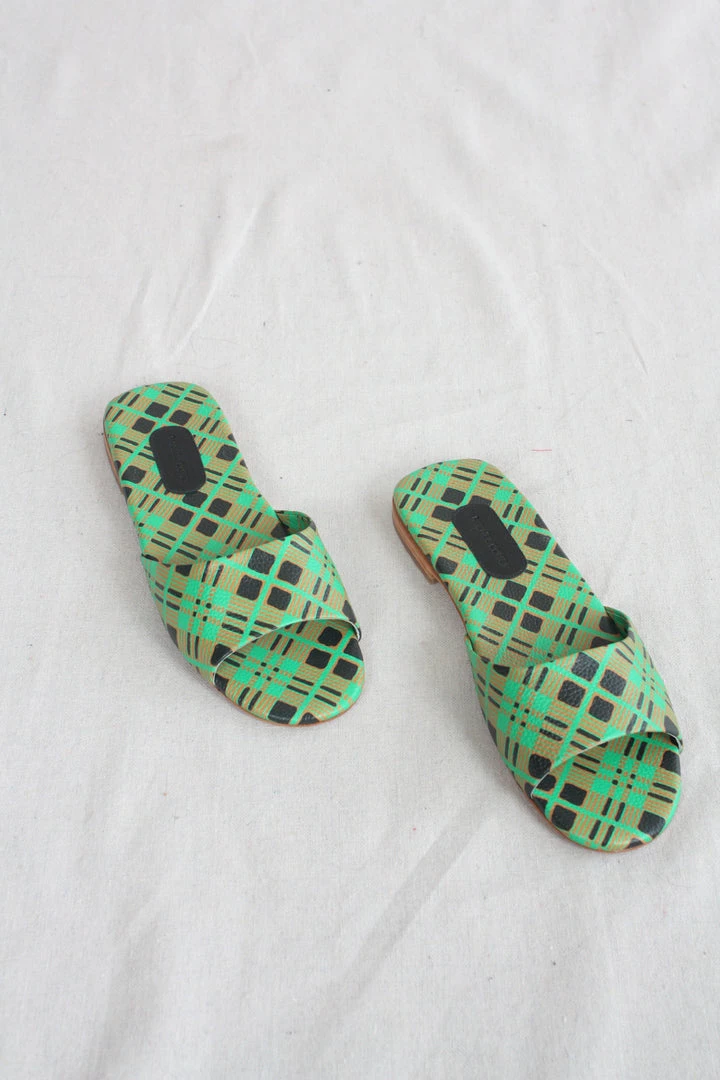 Flat slide sandals in Picnic Check printed leather.