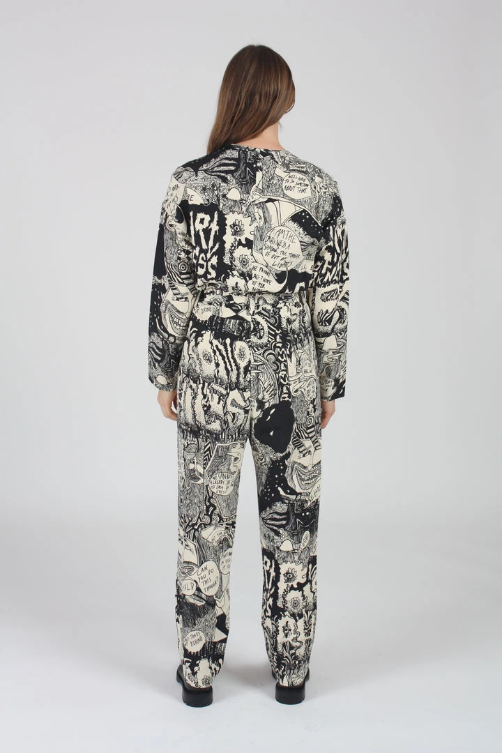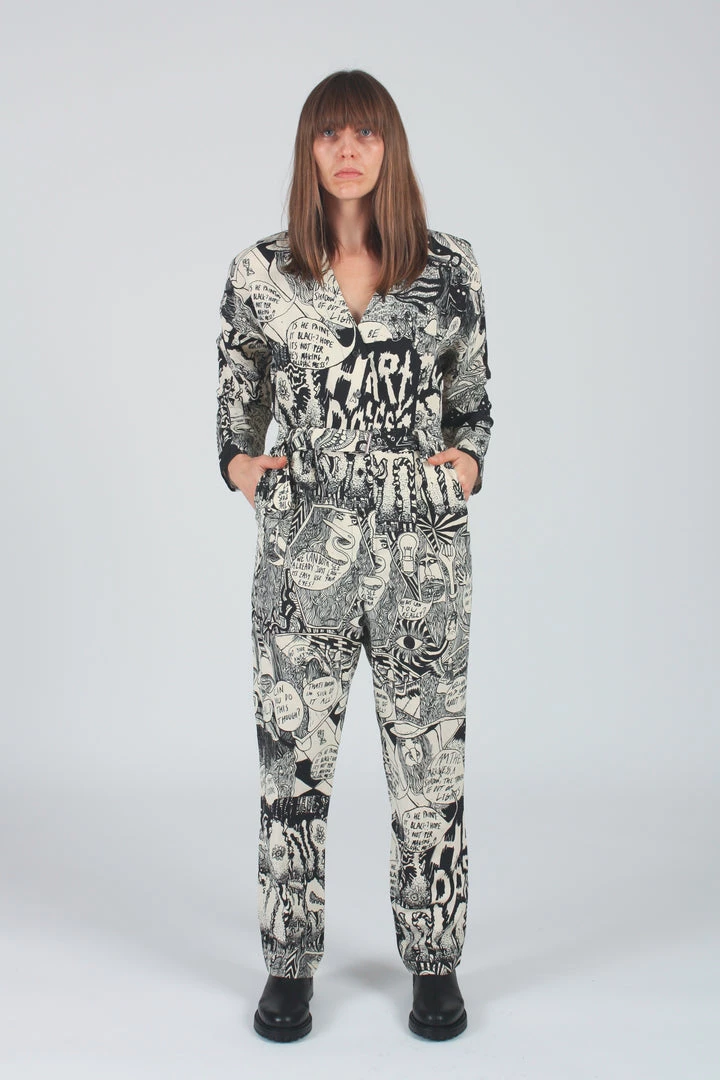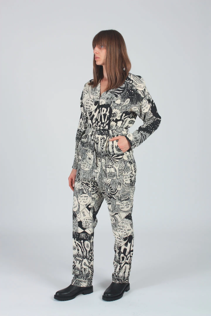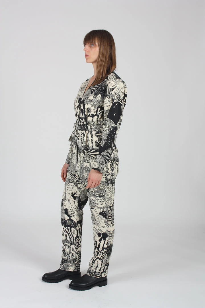 The Glitch is a staple in Rachel Comey’s lineup of jumpsuits. With an underlying column shape, the Glitch has a slightly roomy fit that can be styled to your liking with its belt. The dropped waist and front button closure make it practical and easy to wear. The Glitch is cut from a crisp viscose-linen printed with a Rachel Comey archival “Chatter” print. Button placket closure. Buckle belt at the waist. Slip pockets at the hips.