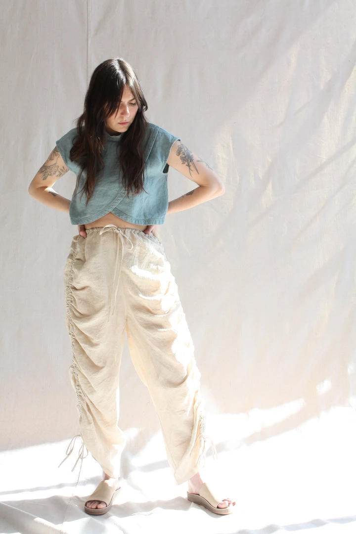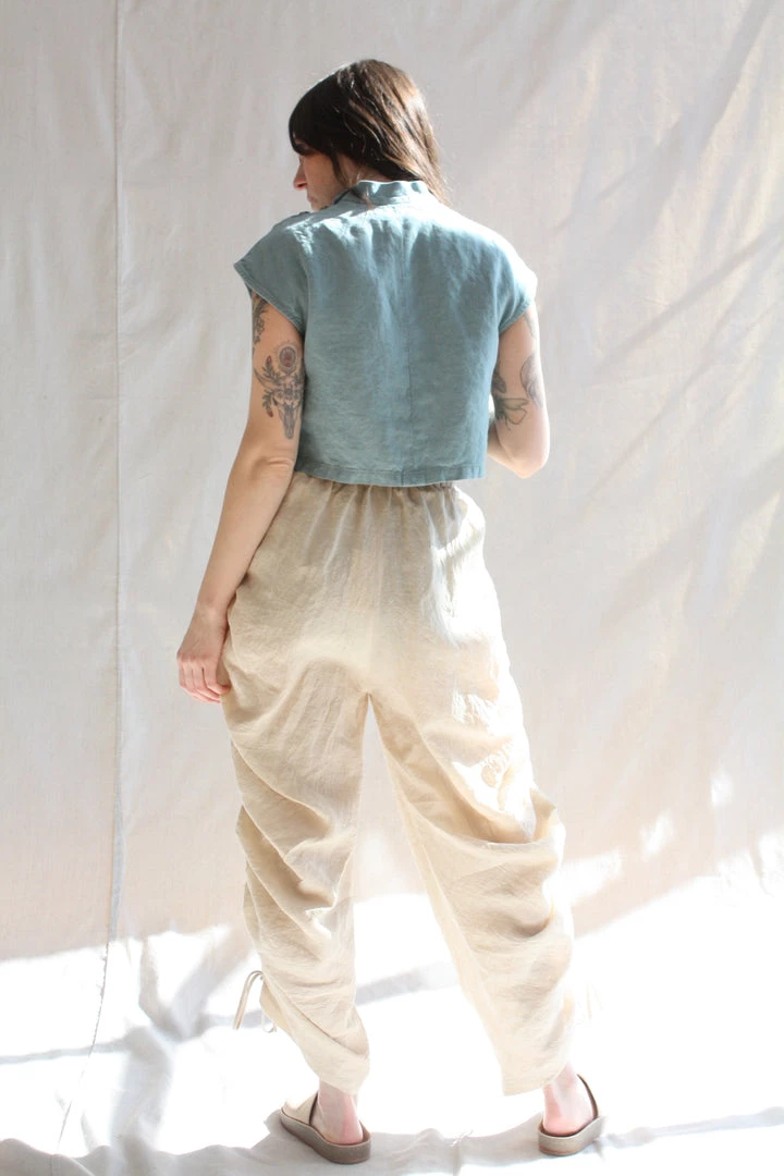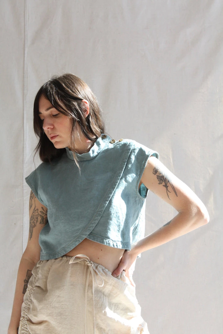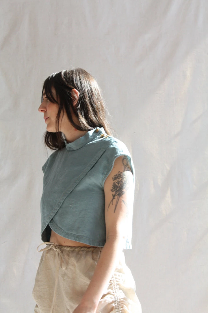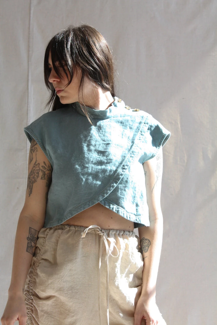 Airy, crossover linen crop top with button-up mock neck, rounded hem and contrast stitching.
