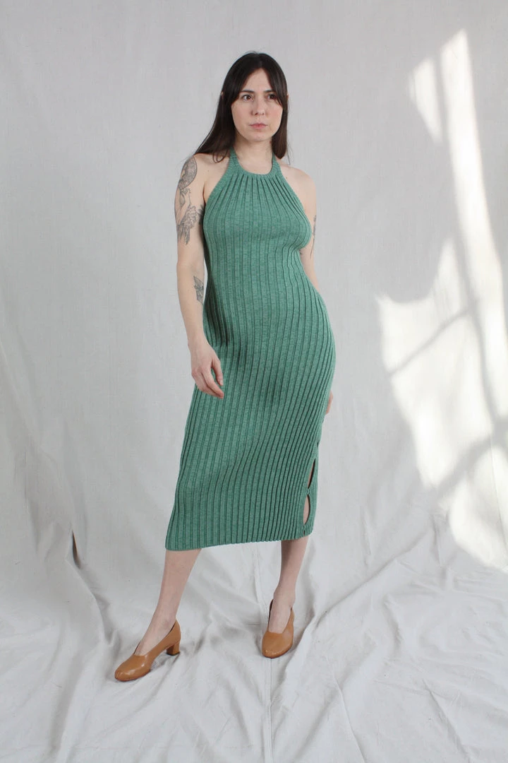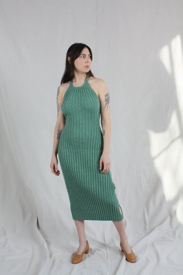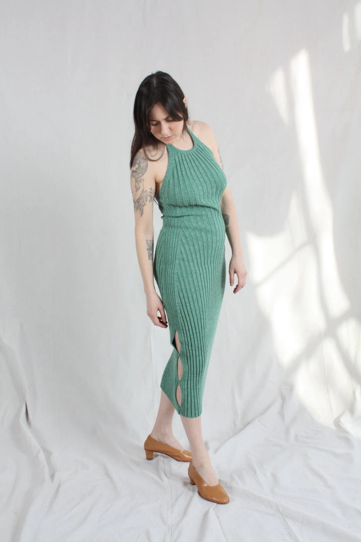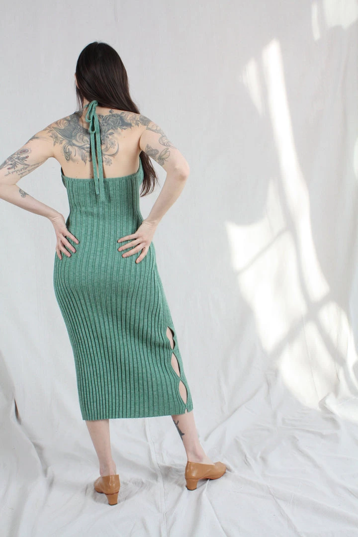 Utilizing the stretch of the yarn, this fitted, halter Salo Dress has engineered ribs and multiple keyhole openings in the side seams above the hem. Slips on. Self-tie at back neck.