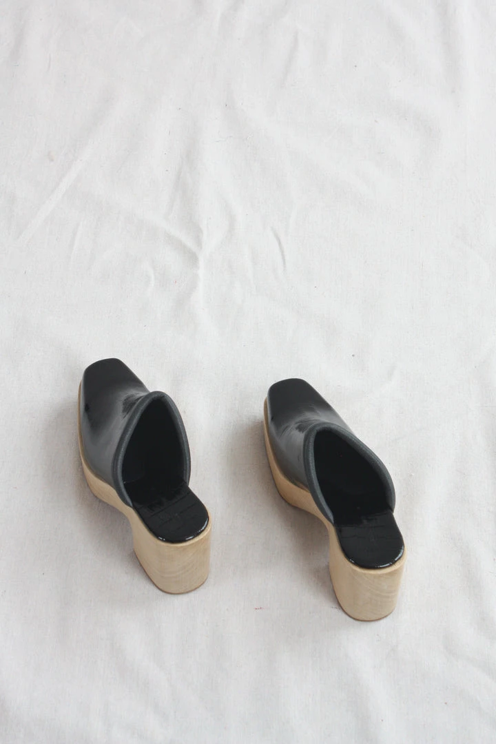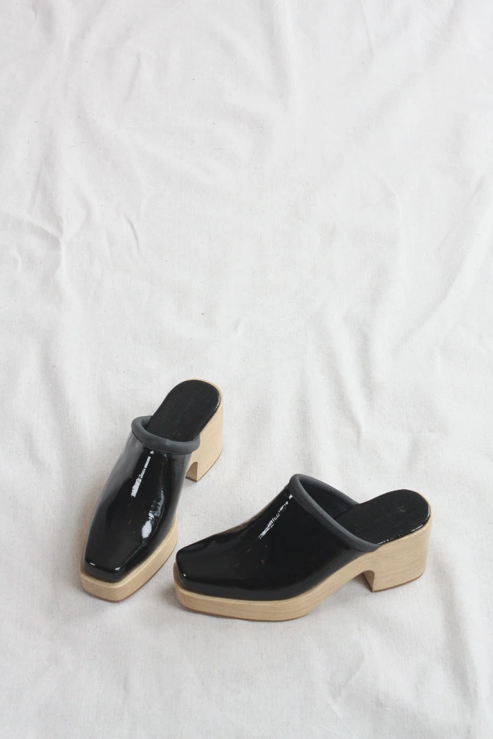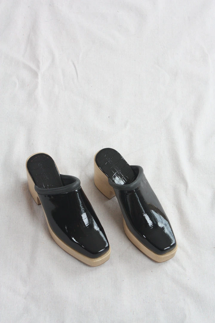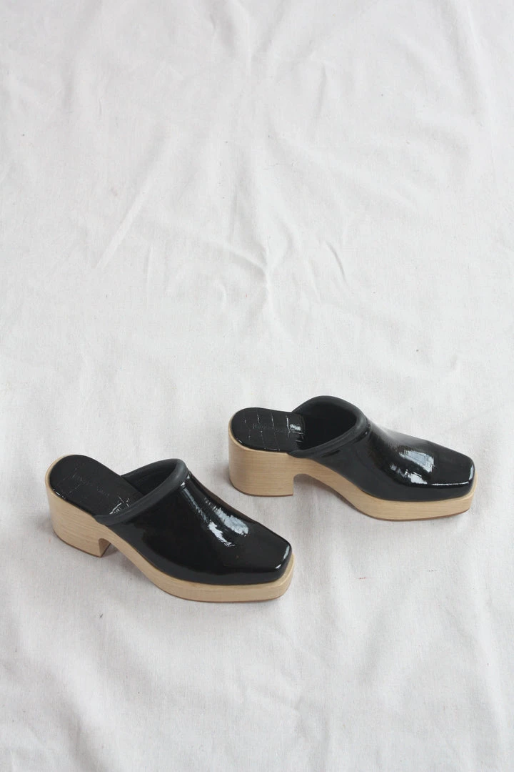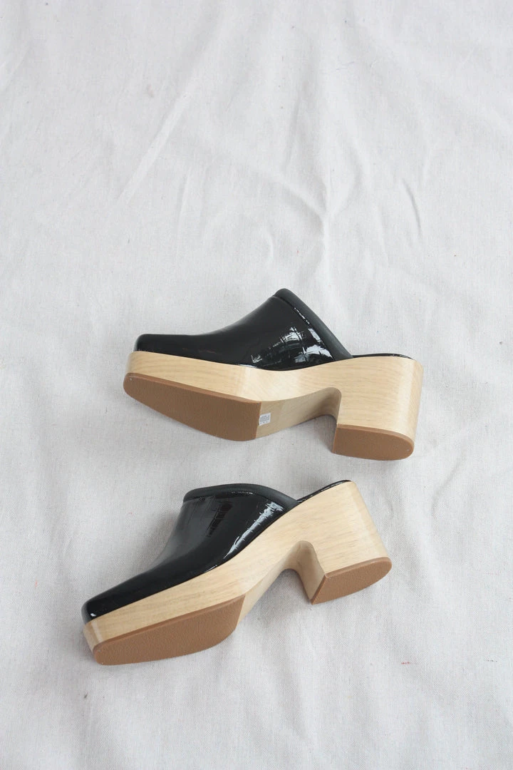 - Upper in 100% Stamped Patent Leather, Sole in 100% Wood
