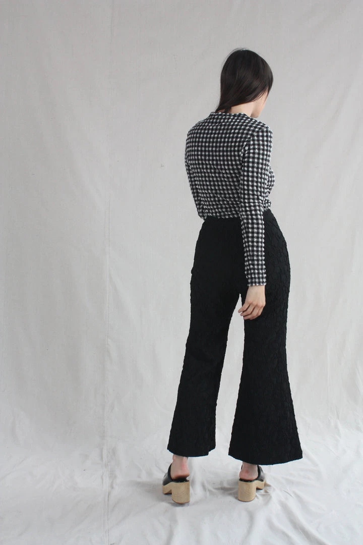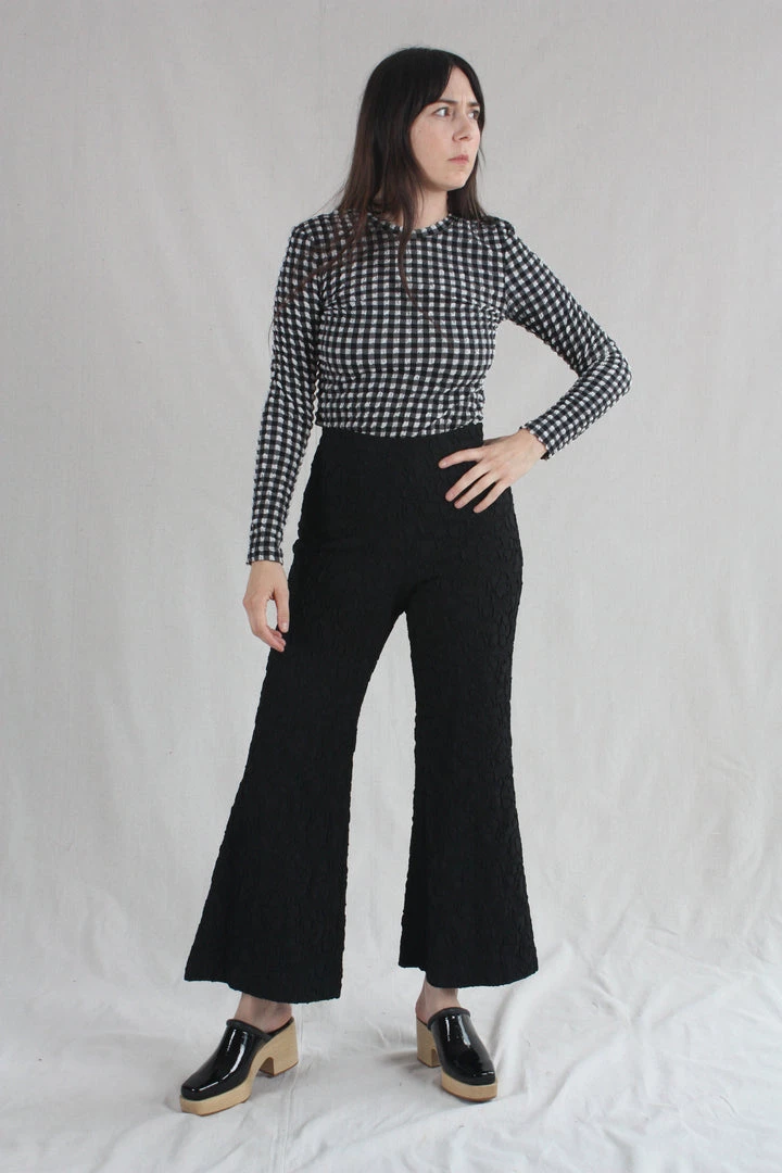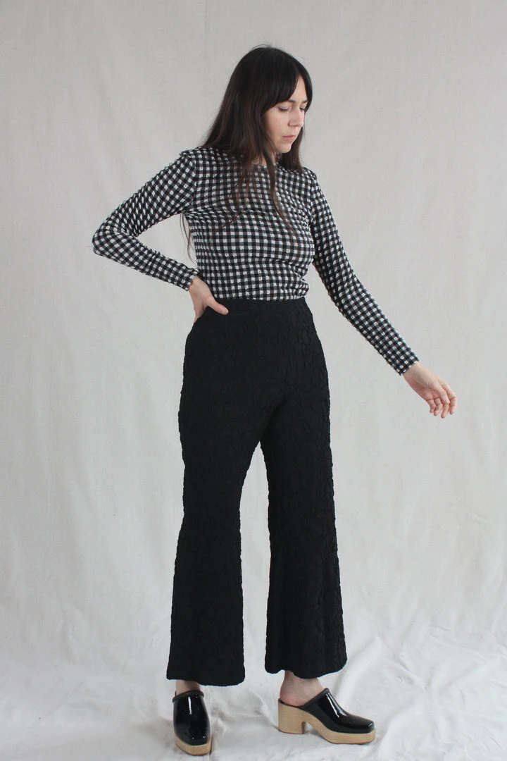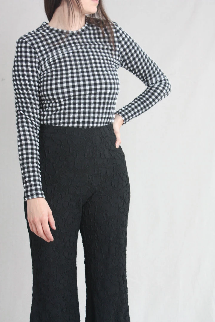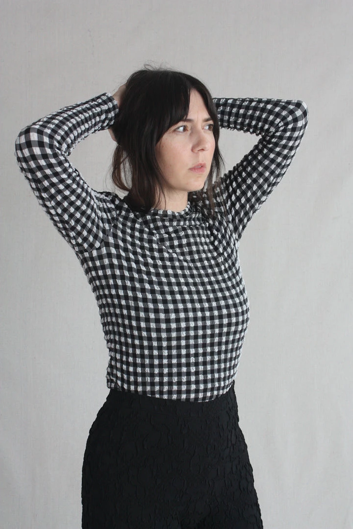 Slim fit top in lightweight, puckered Stretchy Check fabric featuring round neck, long sleeves, straight hem and slightly cropped length.