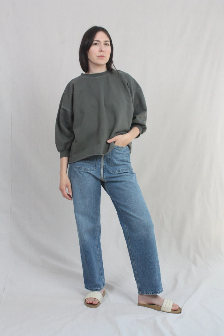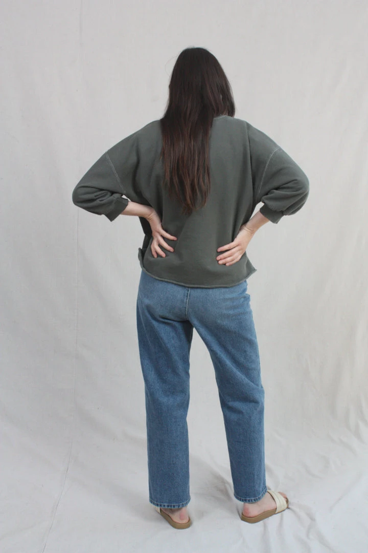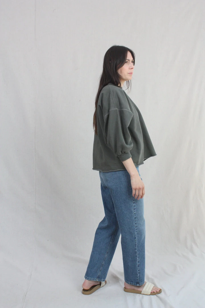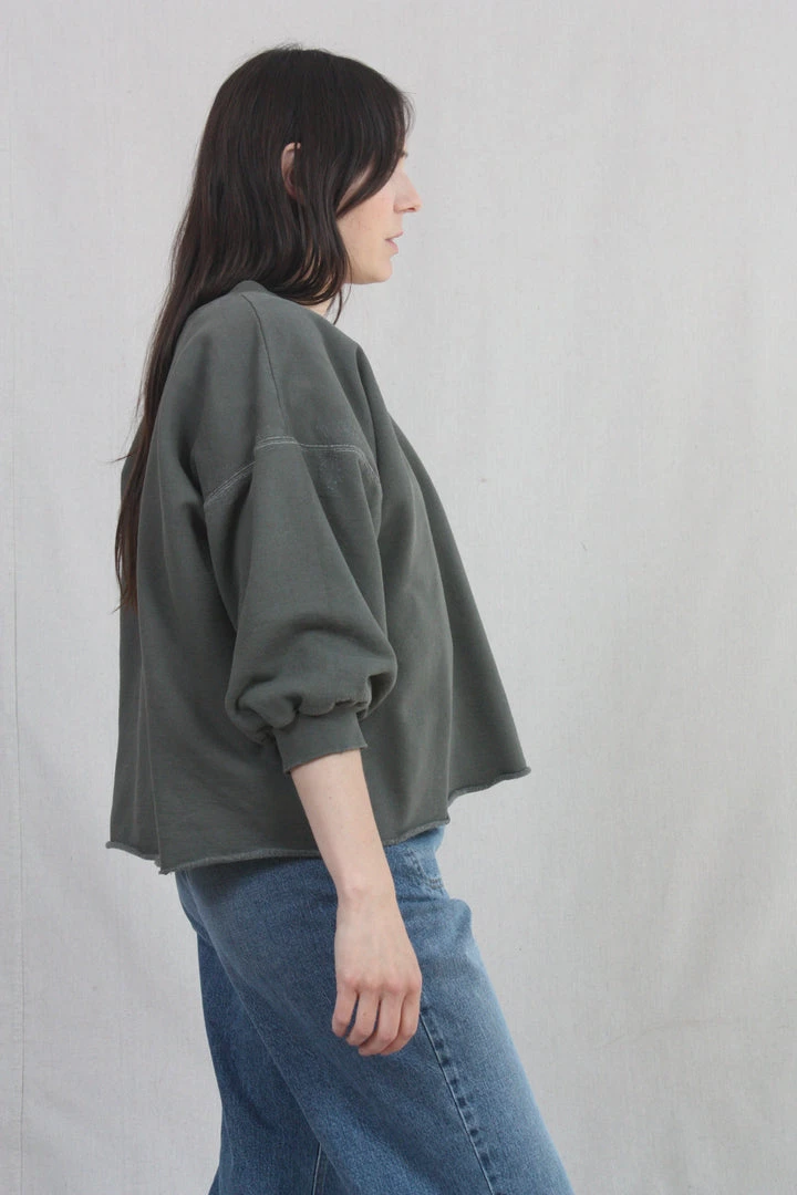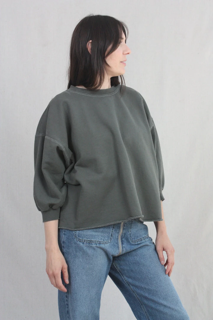 Crewneck sweatshirt with drop shoulders, cropped sleeves, raw edge hemline and unique distressing throughout. Makes a great styling piece for any look.
