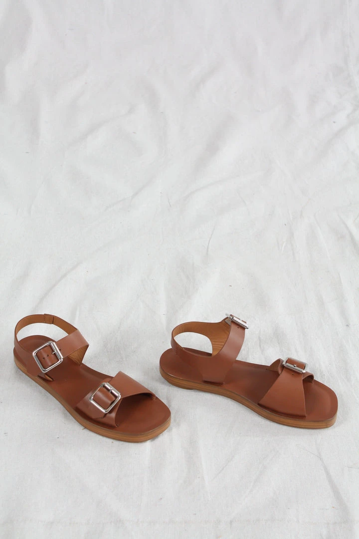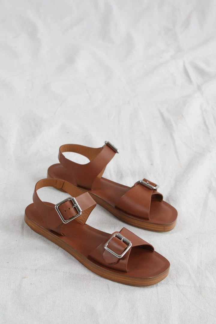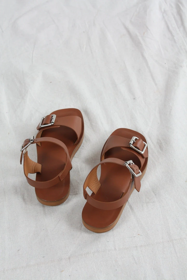 Flatform sandal with adjustable buckle straps and a handmade stacked leather sole.