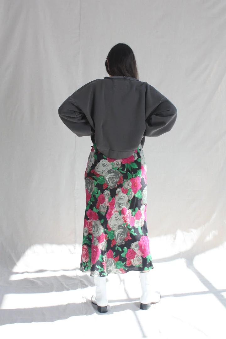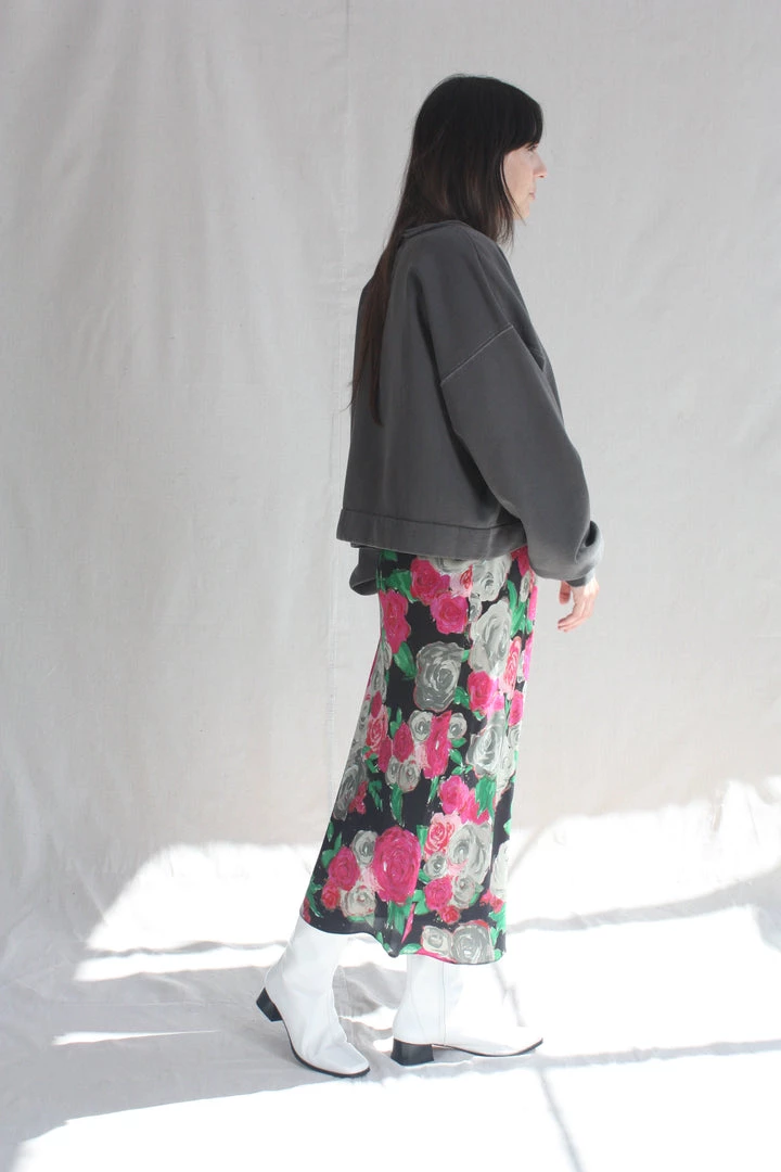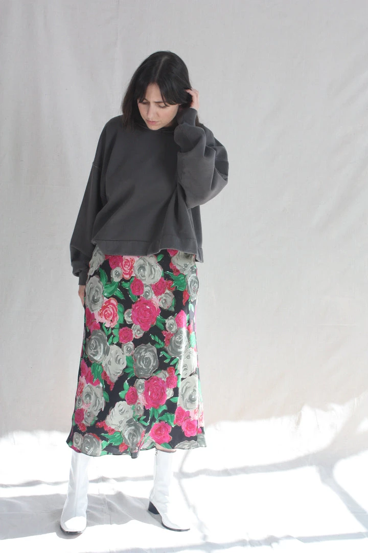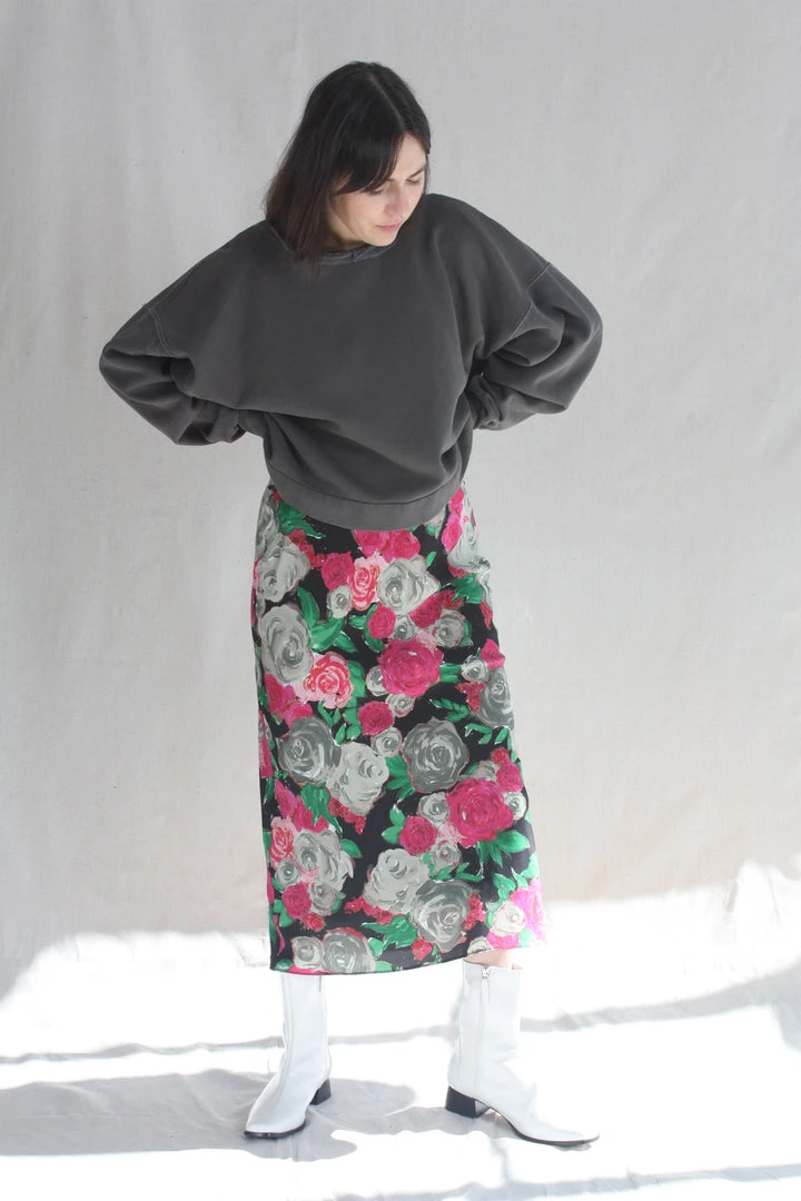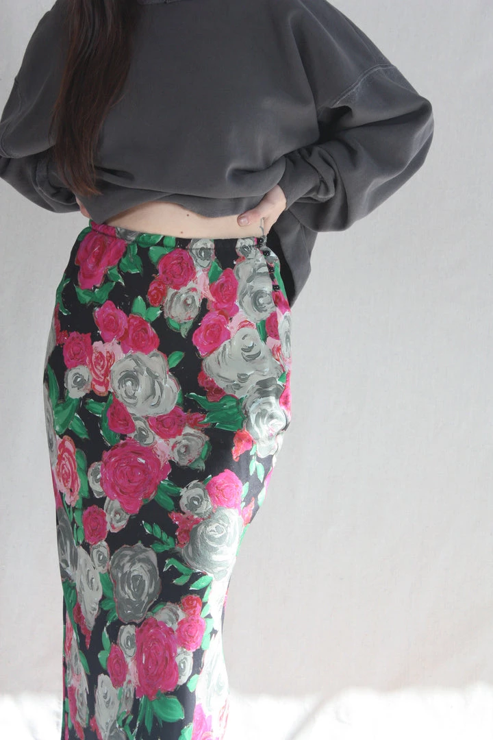 The Glass Skirt is a full-length slip silhouette with a side button closure. Damascena silk crepe de chine is custom rendered and digitally printed on soft, washed silk.