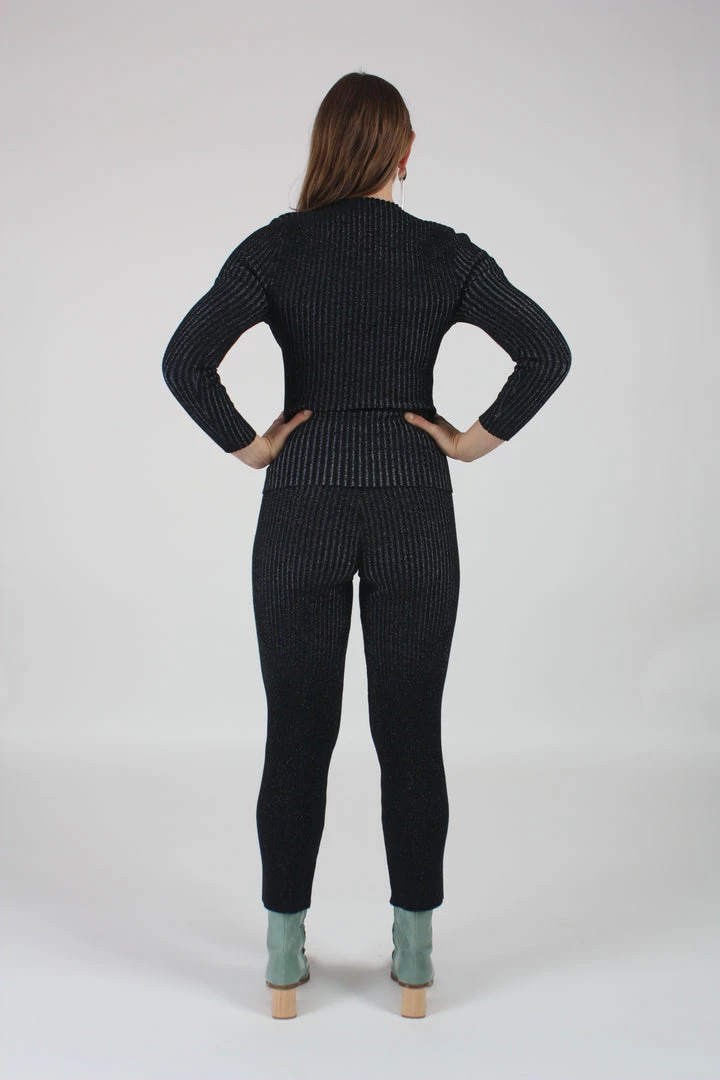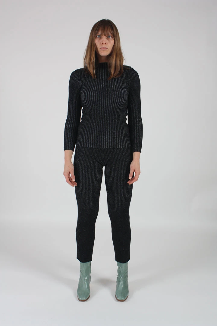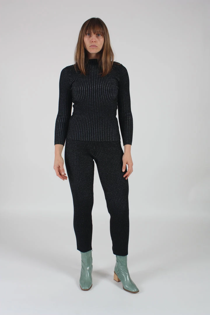 Shrunken ribbed layer pant with a straight-leg trouser fit and high-waist.ย Onyx and blue glitter.