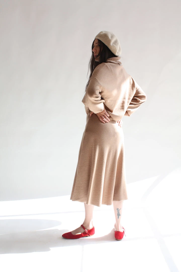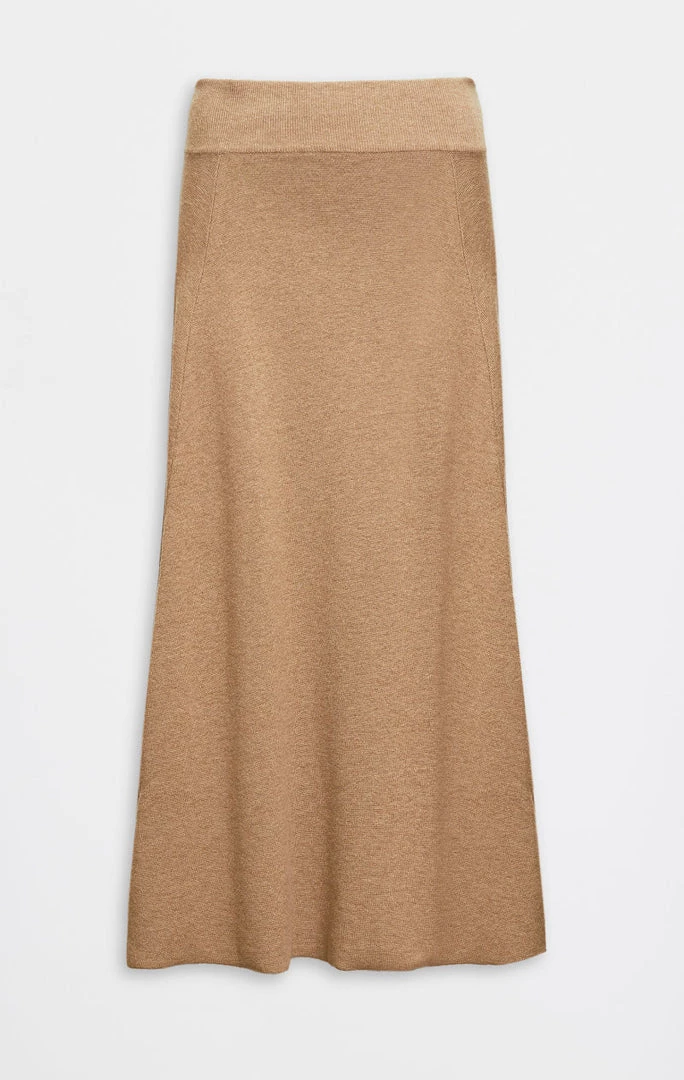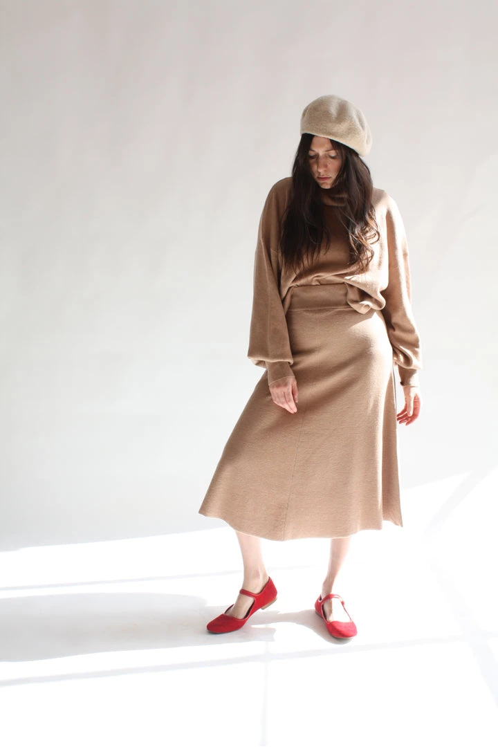 The Arnai skirt is a flared knitted skirt in a lambswool cotton blend. It sits above hip and ends below mid calf. Wear with Lanica sweater for a luxurious, monochrome look. Hand wash only.