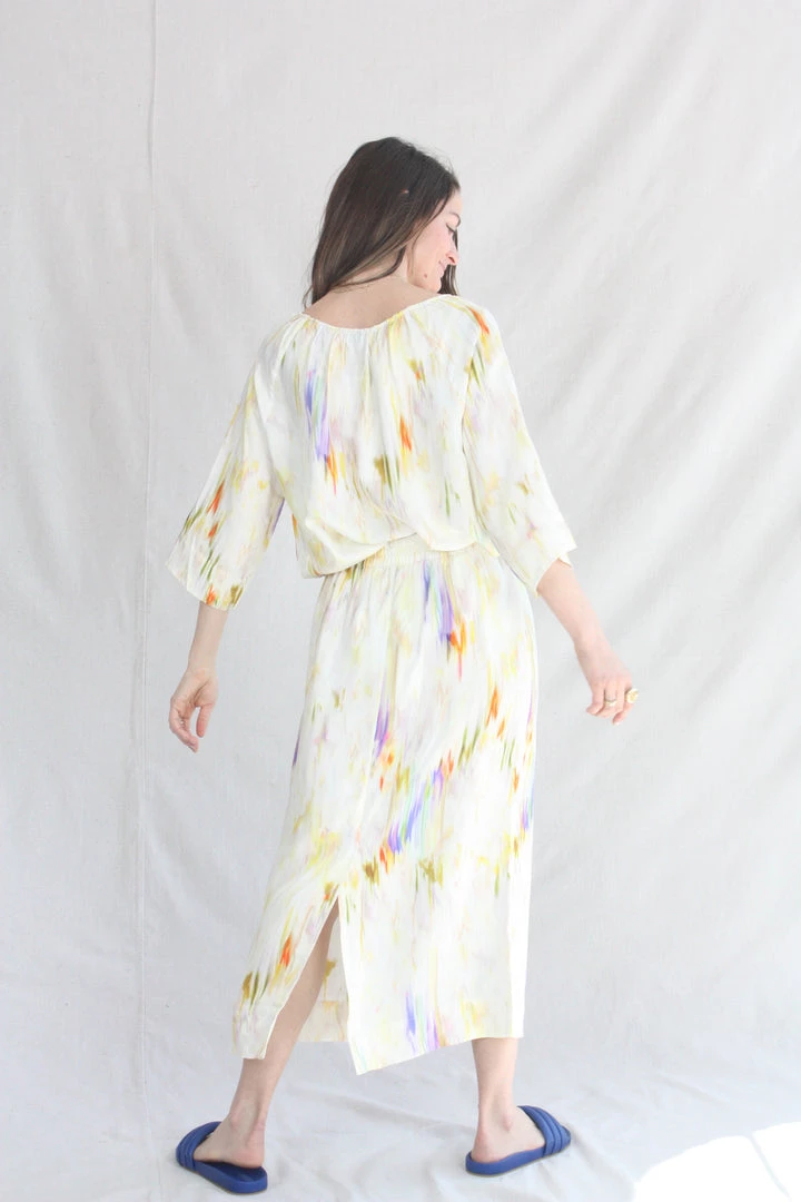 Claire Sungaze is a relaxed skirt with a flowy fit that ends below mid-calf. Claire Sungaze has a drawstring at waist and a slit at back for a sporty, yet casual look. This is a beautiful skirt is made in an allover print in multi color, made in a FSC certified (Forest Stewardship Council) viscose. This means the organizations works to protecting biodiversity, indigenous peoples’ rights, worker’s rights, and areas of significant environmental or cultural importance.