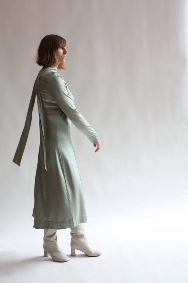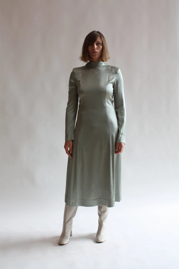 The Acela dress is a midi length dress with long sleeves in a silk bamboo crinkled fabric with a luscious sheen. Loose fit with a flare shaped skirt for a flowy look. Dry clean only.