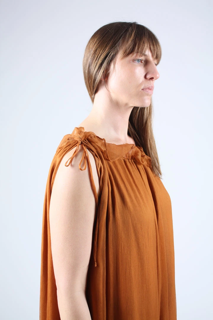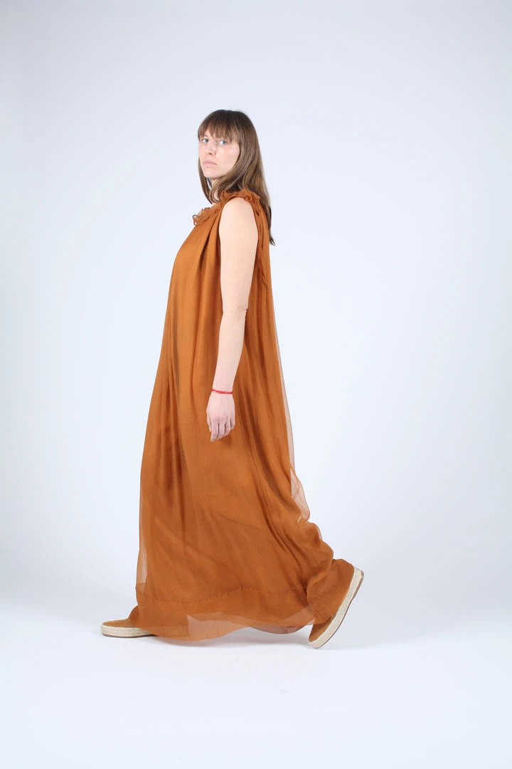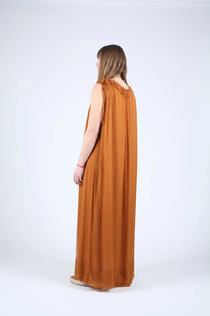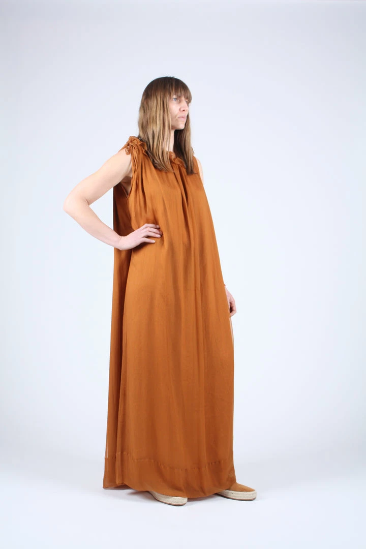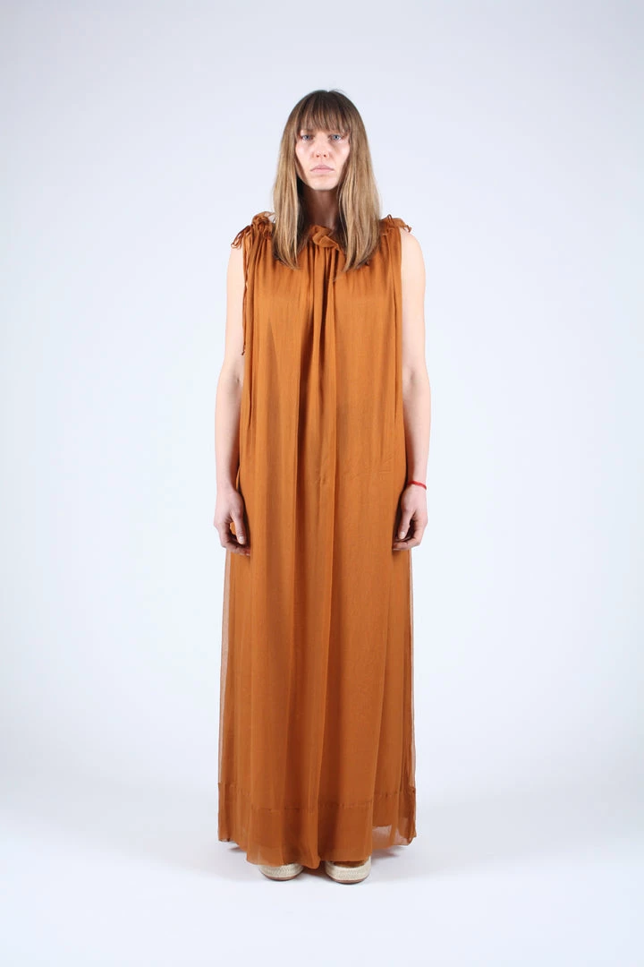 Jeyio is a sheer maxi dress with gathered details. It has drawstrings on each shoulder for an adjustable neckline and no sleeves.