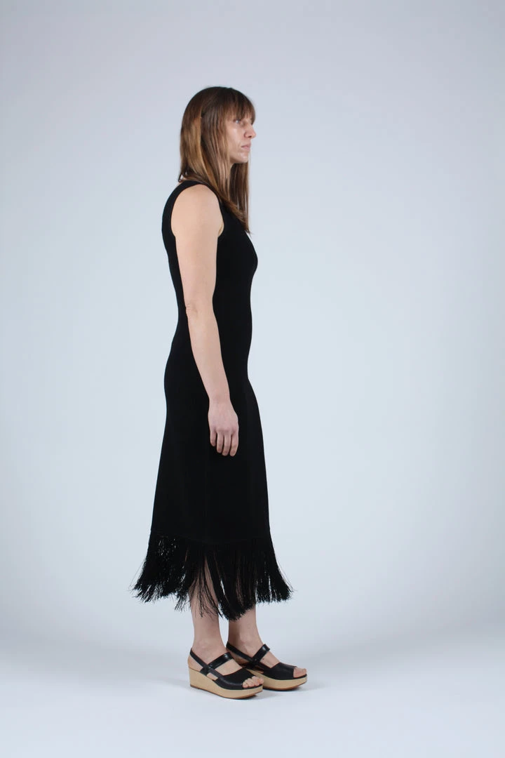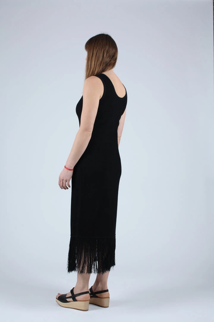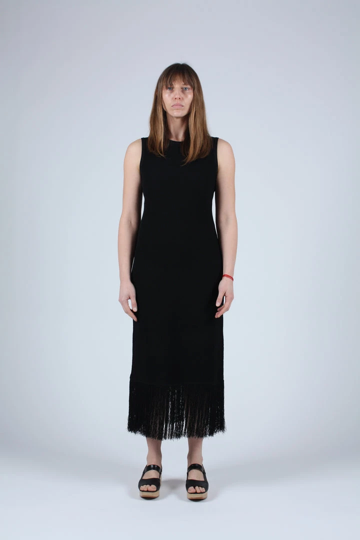 Ettahra is a knitted, sleeve-less dress with a cropped length. Fringe at the bottom hem creates movement.ย