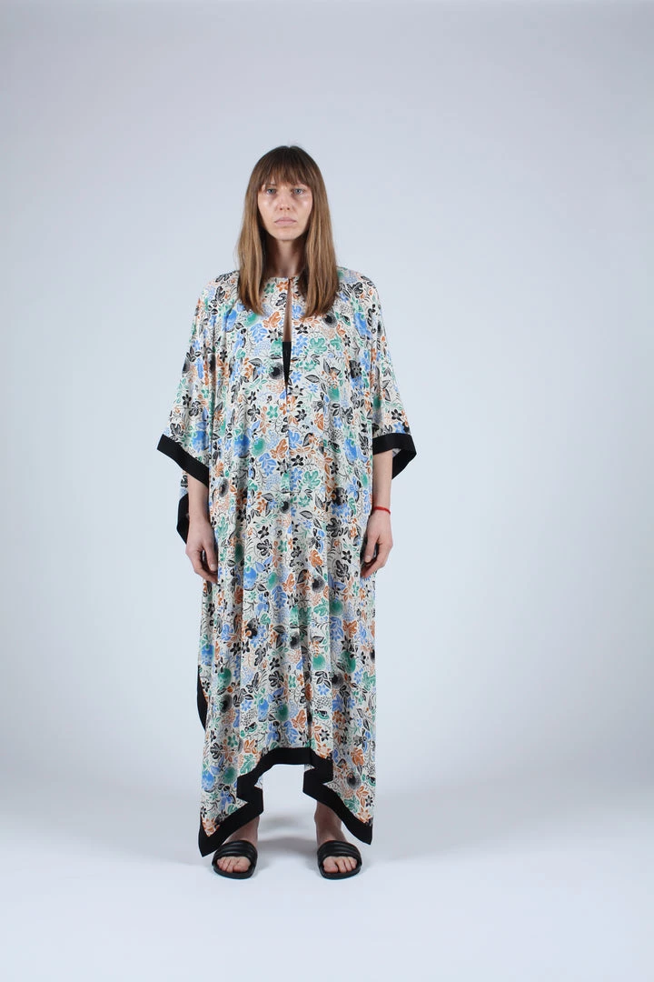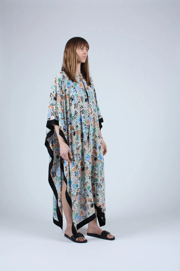 Nalu is a squared, voluminous floorlength cape in an original print from the Rodebjer studio, with inspiration drawn from a Moroccan garden. It has a hook-and-eye button front.