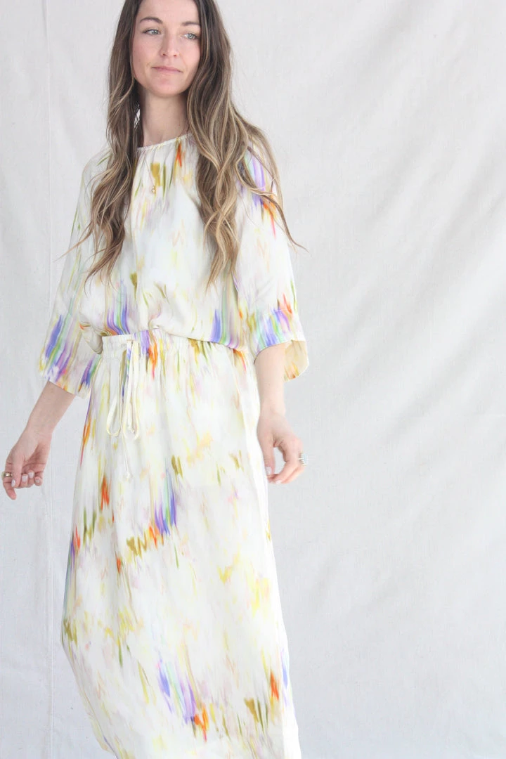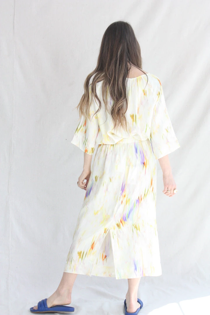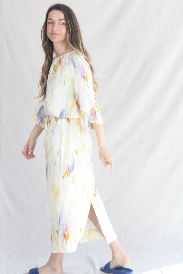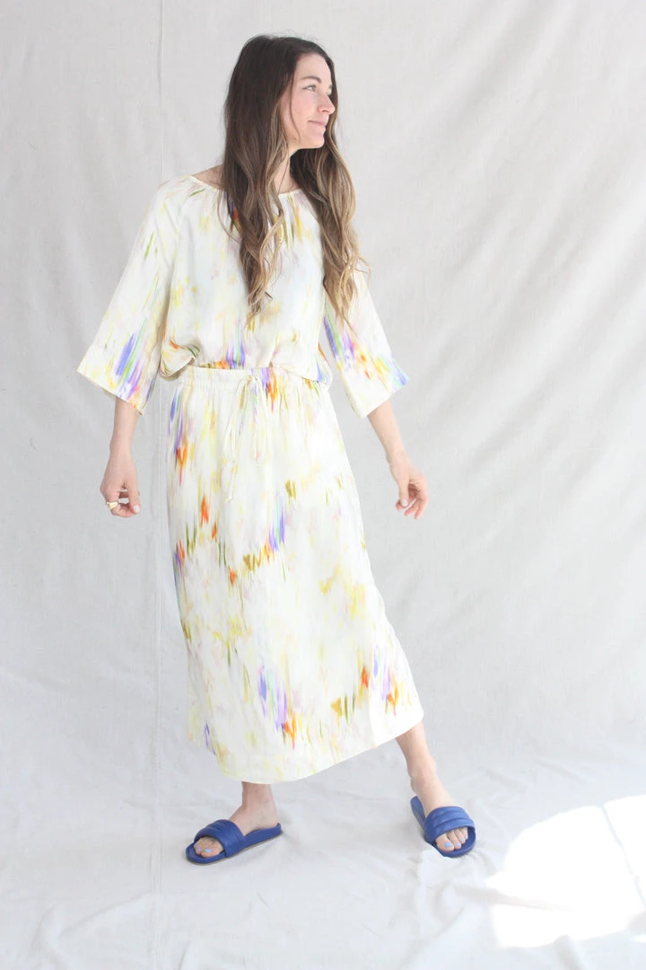Miya is a relaxed blouse with cropped sleeves, a round shirring neck and a keyhole opening at back. This beautiful blouse is made in a flowy 100 % FSC-certified (Forest Stewardship Council) viscose in an allover print. This means the organizations works to protecting biodiversity, indigenous peoples’ rights, worker’s rights, and areas of significant environmental or cultural importance.