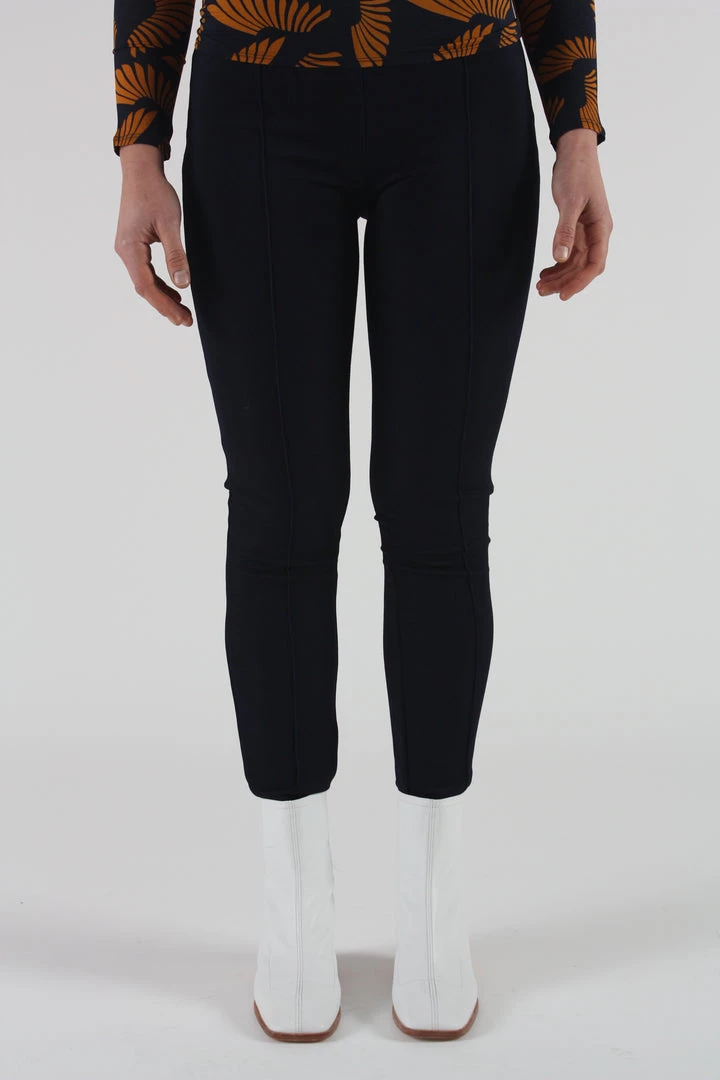 The Tibor slim pant is cut from a luxurious and modern structured dark navy jersey fabric. The Tibor pants have minimalist detailing and stitched pleats along the leg which creates an elongated silhouette.