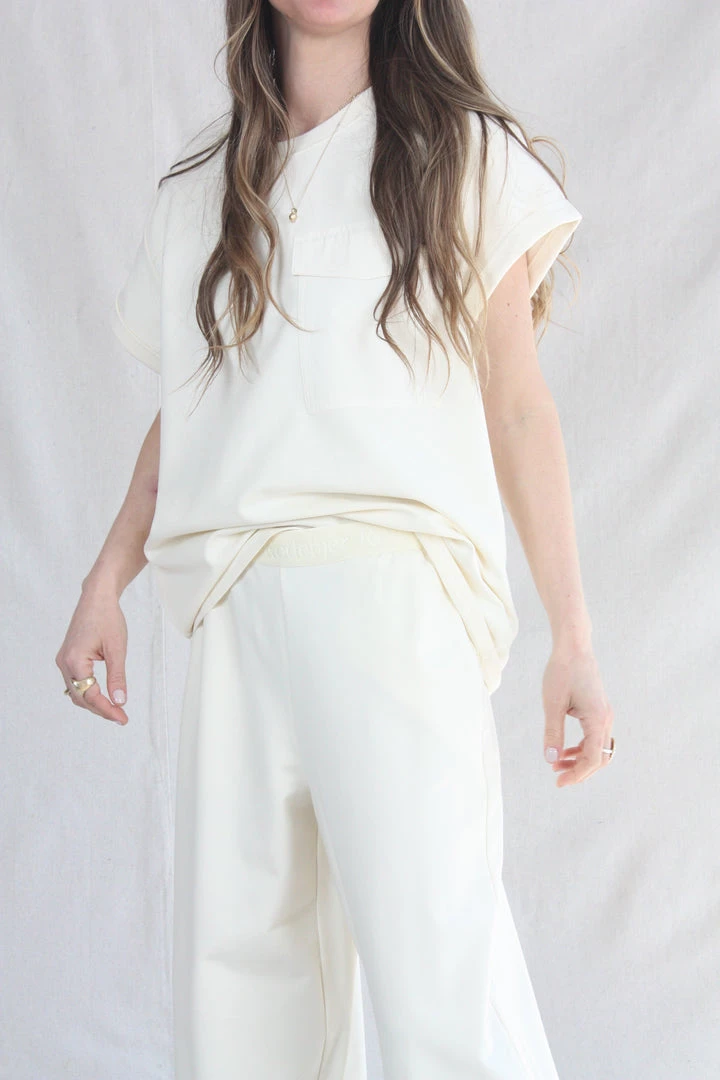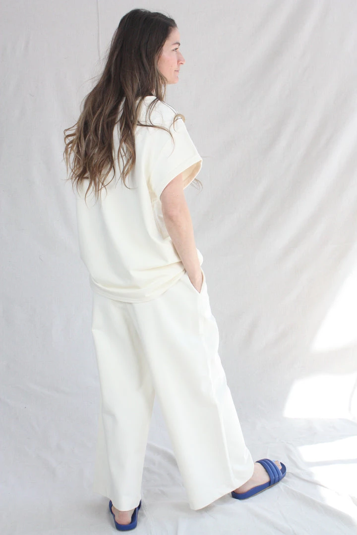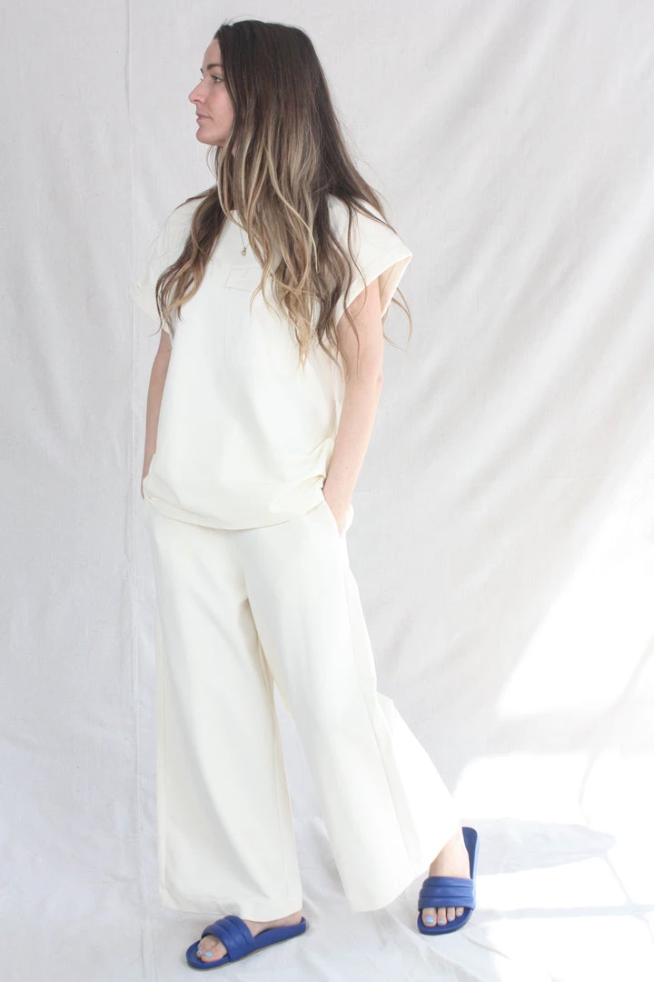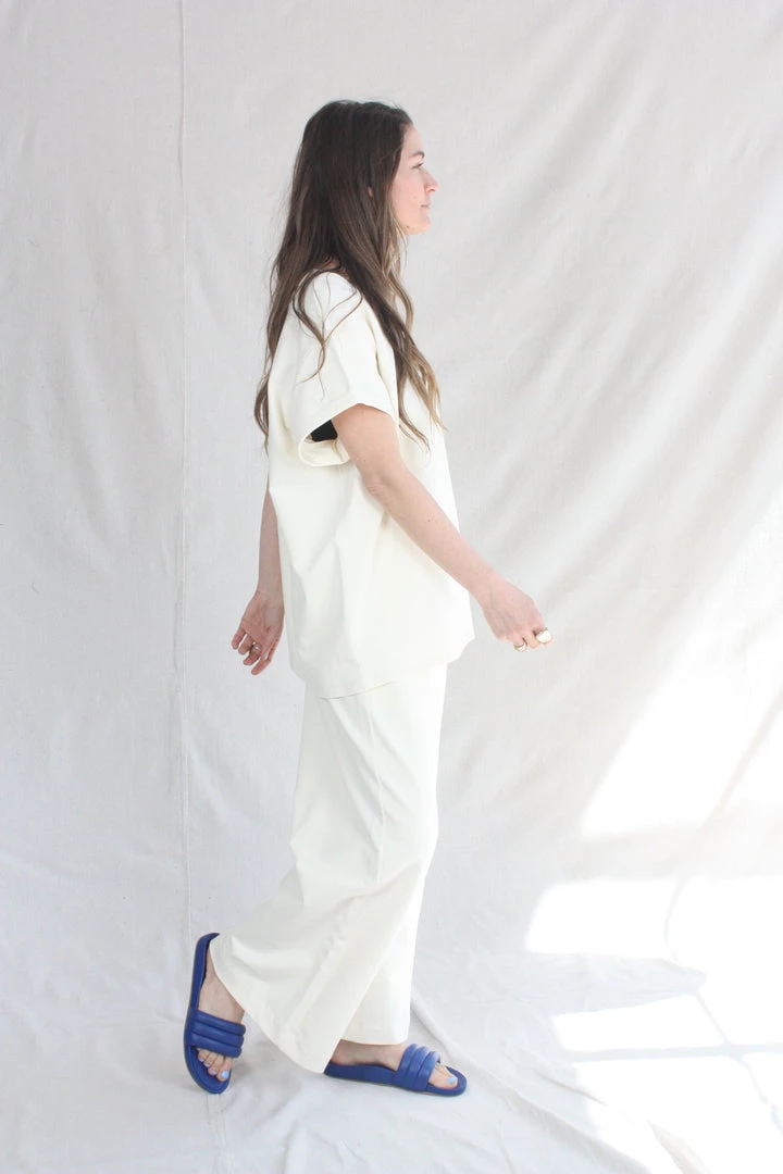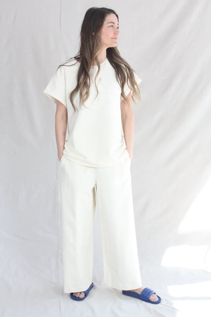 Roma is a relaxed fit pant with a flared, flowy, slightly cropped leg length. Mid-rise waist with a Rodebjer logo elastic band for a comfy and trendy look and feel. Roma is made with sustainability in mind and are made of GOTS certified organic cotton instead of traditional grown cotton.