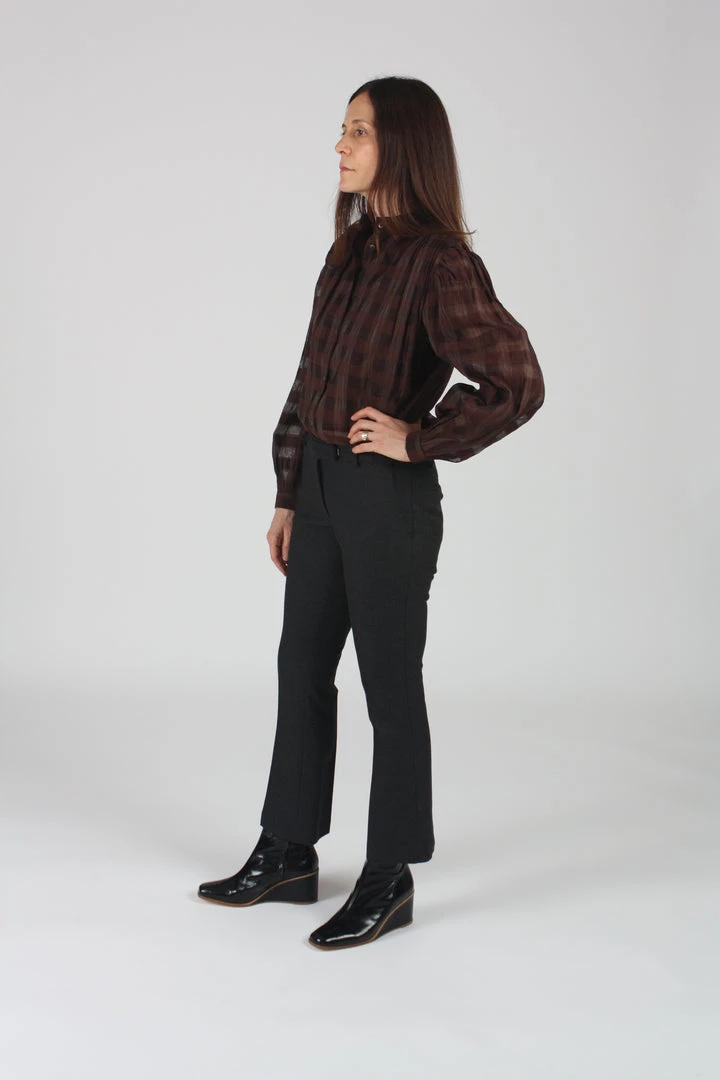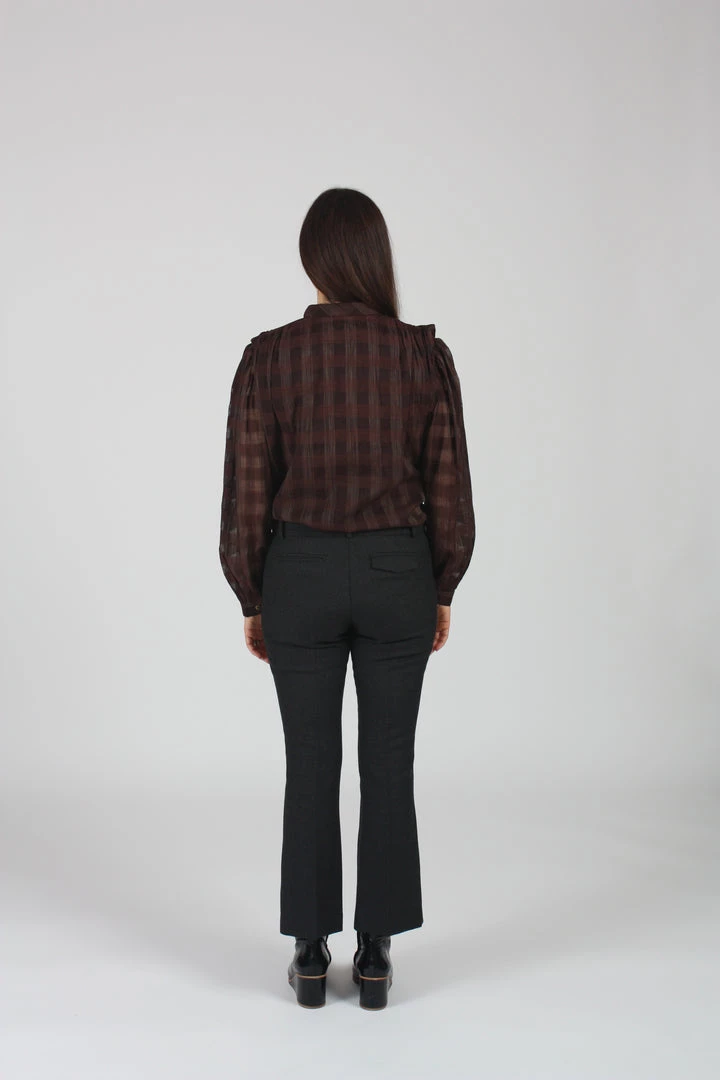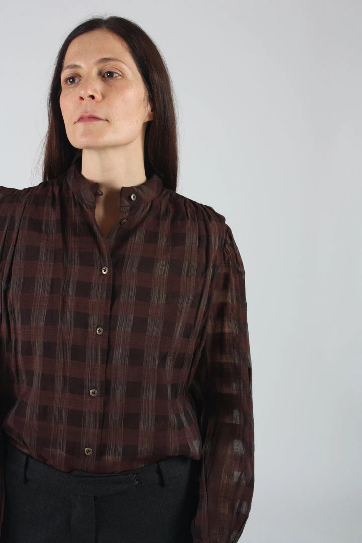 Long sleeve button front top with blouson sleeves.
