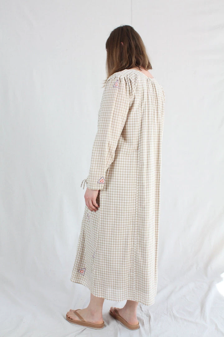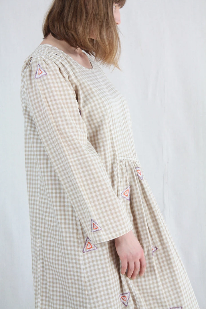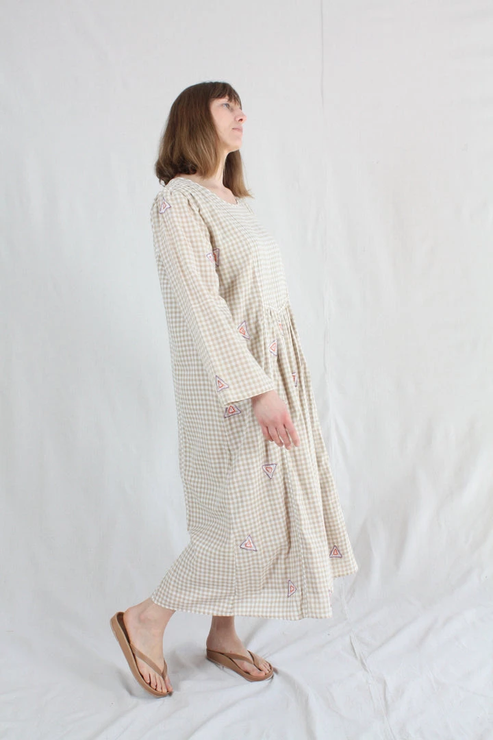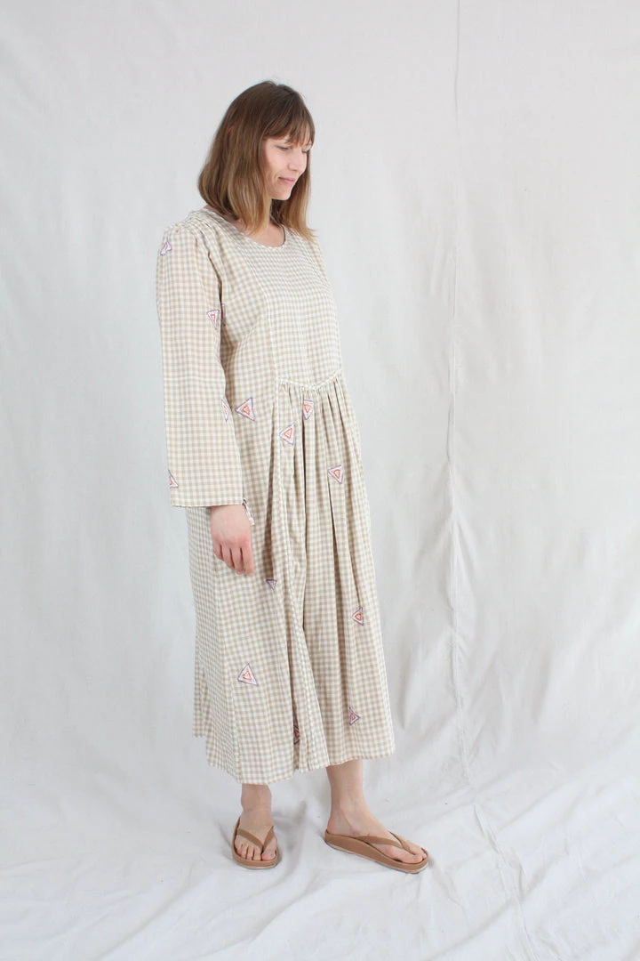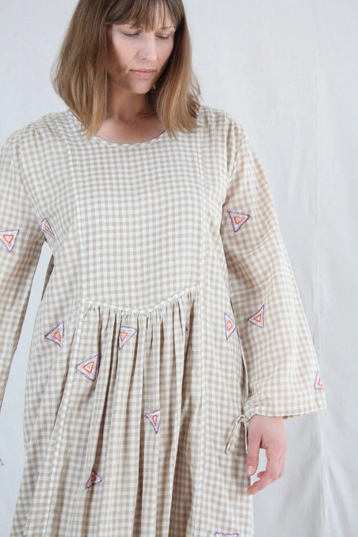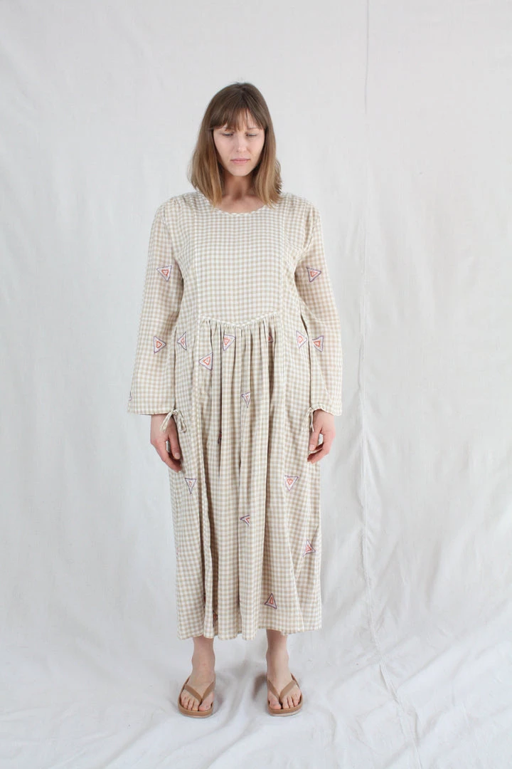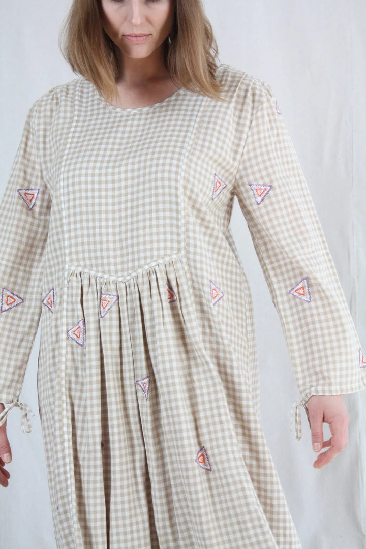 Elegant, long sleeve dress with top stitching detail on the chest. Featuring gathered sleeves and a v-shaped waist with gathers. Embroidered details throughout the fabric with a hem that hits mid calf.