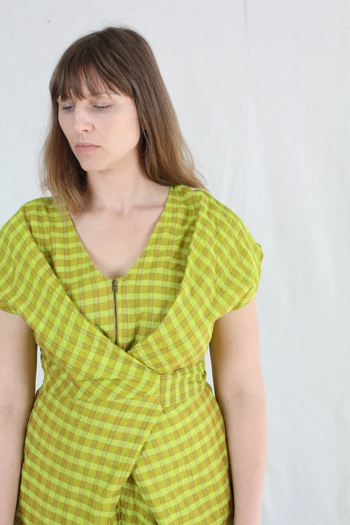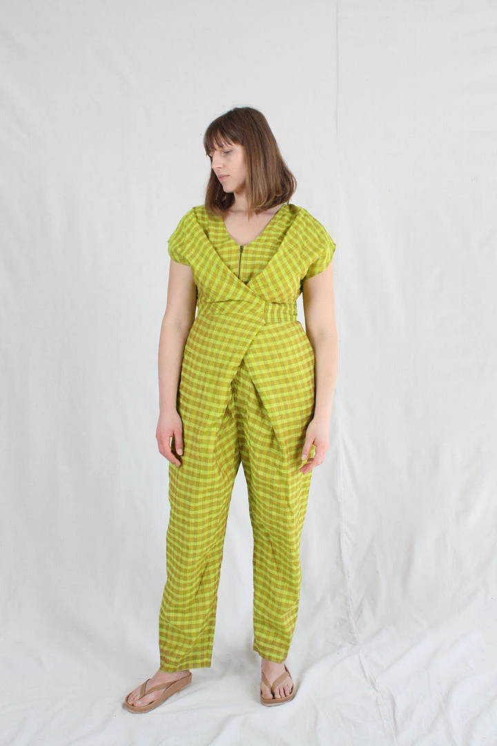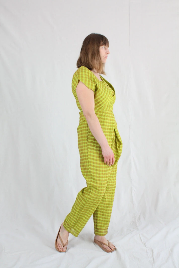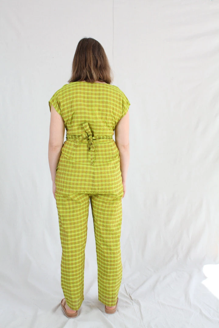 Short-sleeve jumper with wrap waist that can be tied in the front or back. Placket buttons up the front. Features hidden side pockets. Fits loosely but can be cinched at the waist as per body measurement or comfort! Bottom hem tapers for a sleek look and hem falls above the ankle.
