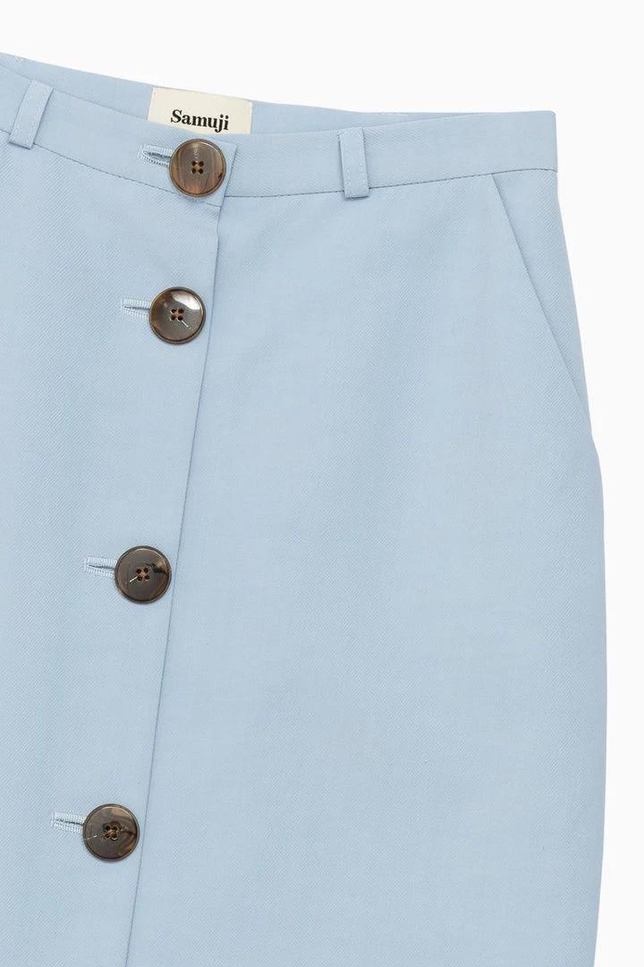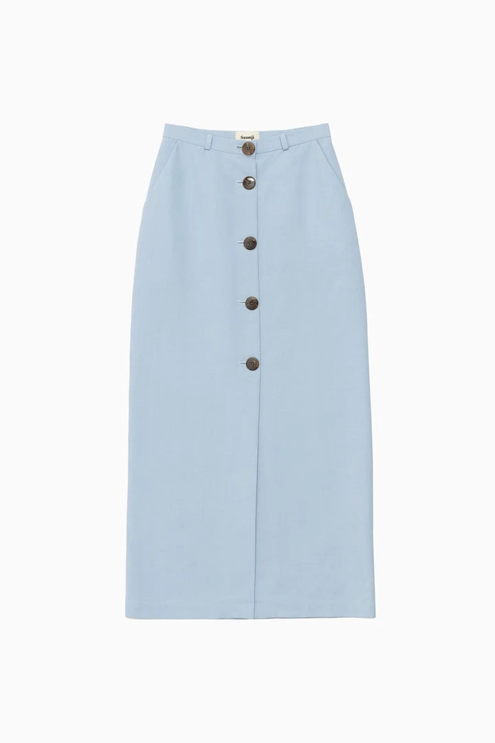 The Boipello Skirt is a fresh take of the classic pencil skirt, made from a light blue cotton blend. This ankle length and straight cut skirt has a button front, belt loops and side slit pockets.