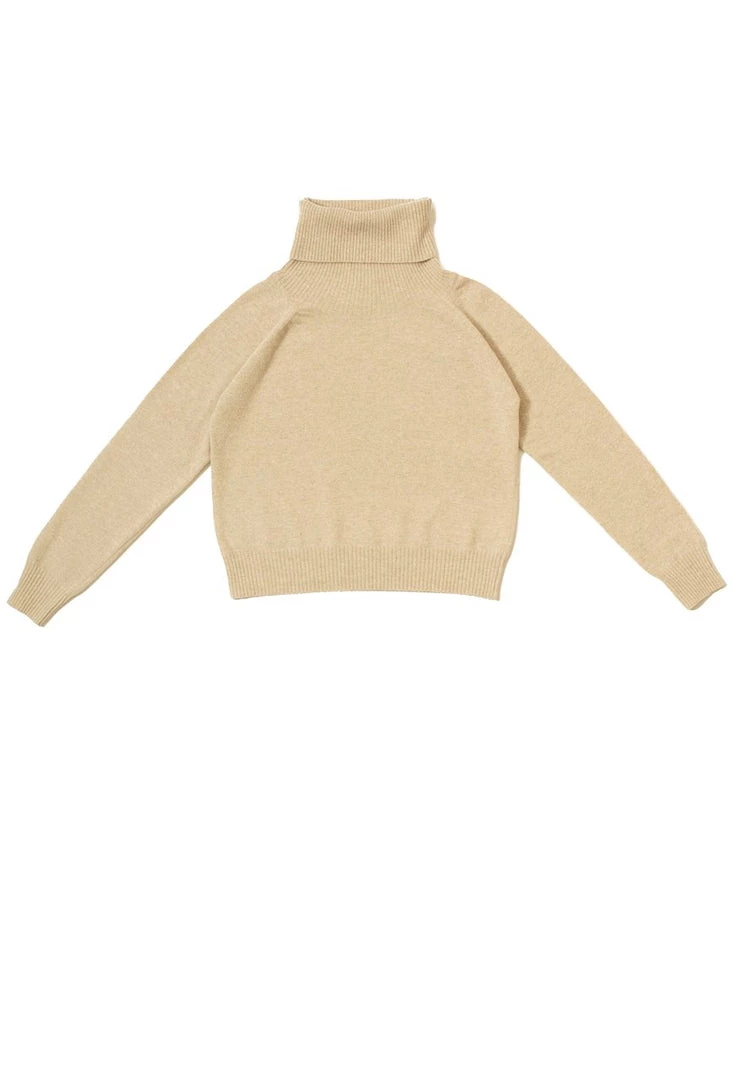 The Abi sweater in a warm sand has a turtleneck and has a slightly relaxed fit.
