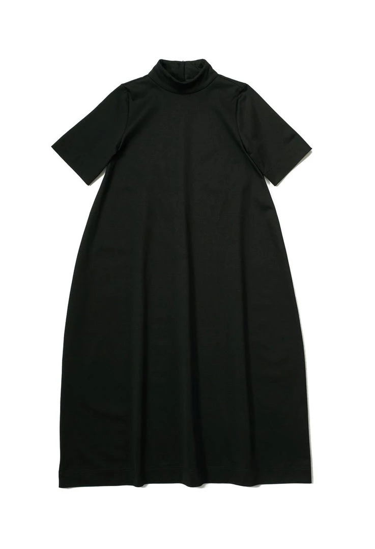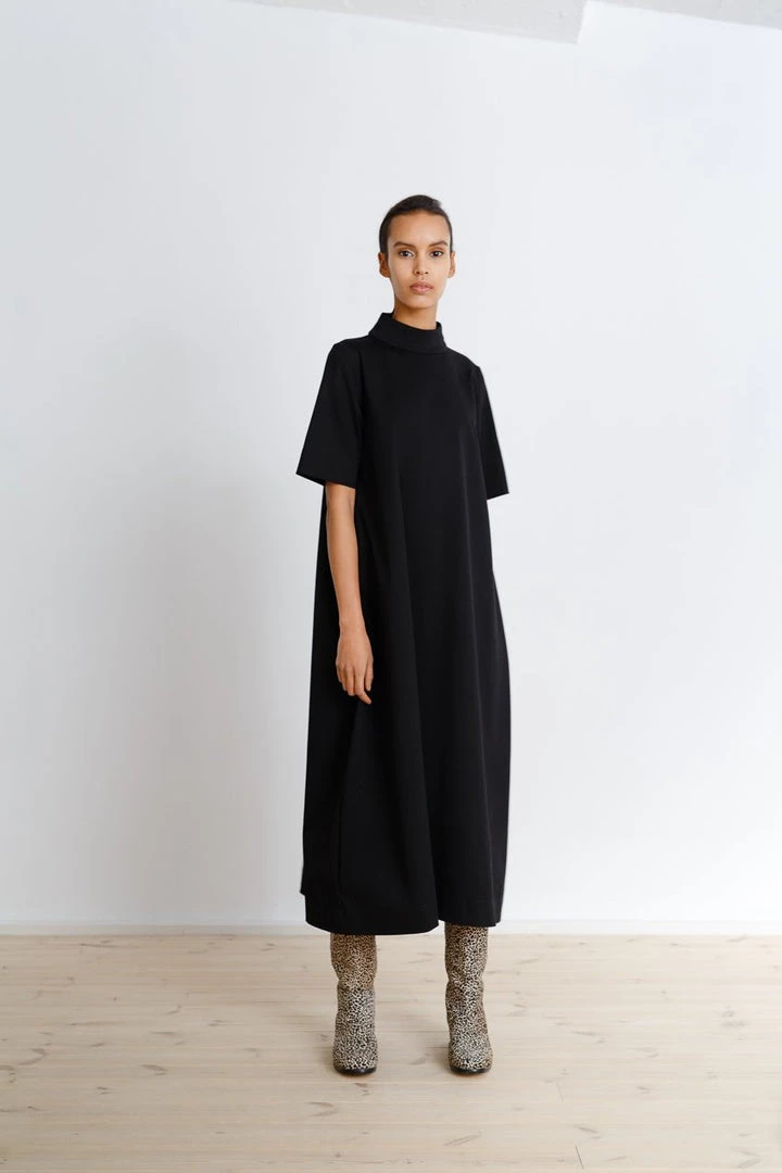 Yesenia Dress is made from black cotton fabric. The dress has short sleeves and a turtleneck collar. It has a zip fastening at back and a slightly a-lined cut.