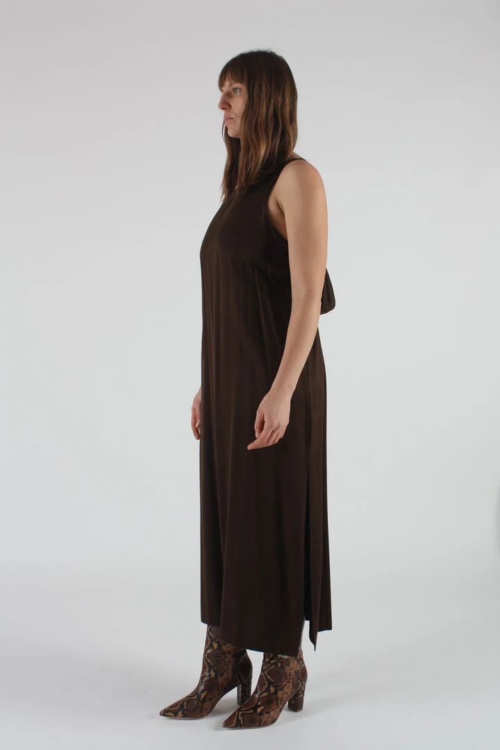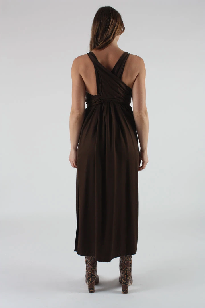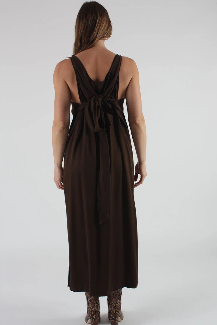 The Tie Dress is a signature, best selling Shaina Mote style. A long, versatile draped dress with side slits, deep scoop neck and armholes with multi functional ties. Tie straps around waist backwards and forwards or twist at front waistline for different looks. Tencel twill in a rich earthy brown.