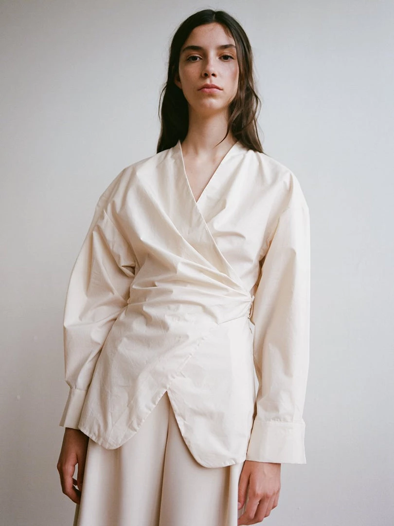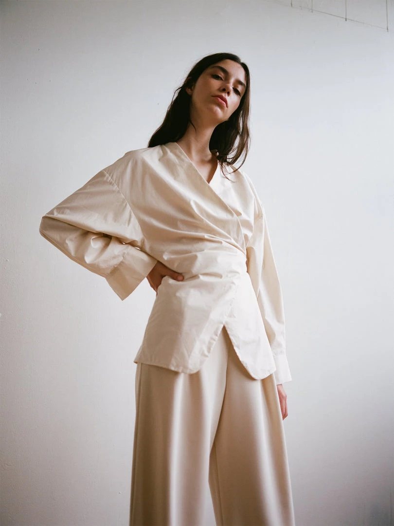 A softly draped wrapping top with wide boxy shoulders. Shirting inspired sleeve with pleat and cuff at hem. Made in a crisp cotton poplin. Designed with intention to last for years to come, all seams are dually reinforced french seams.