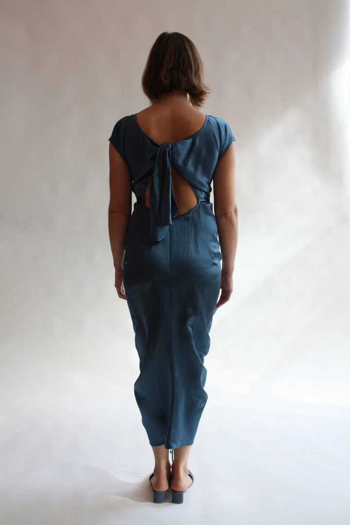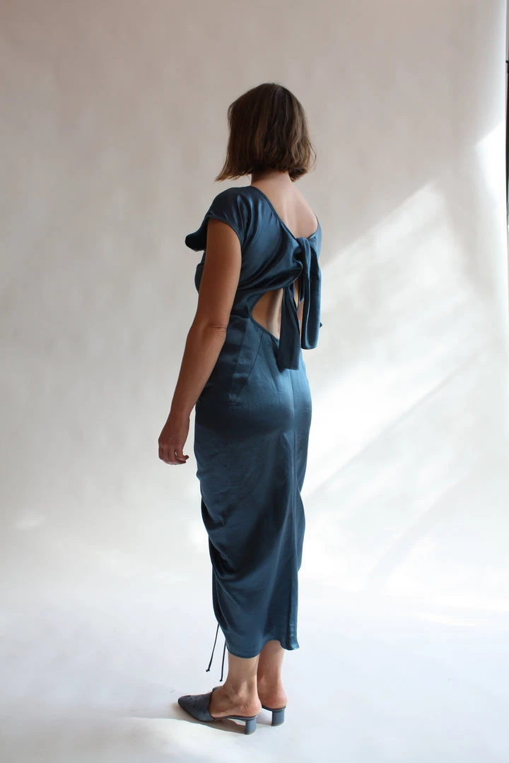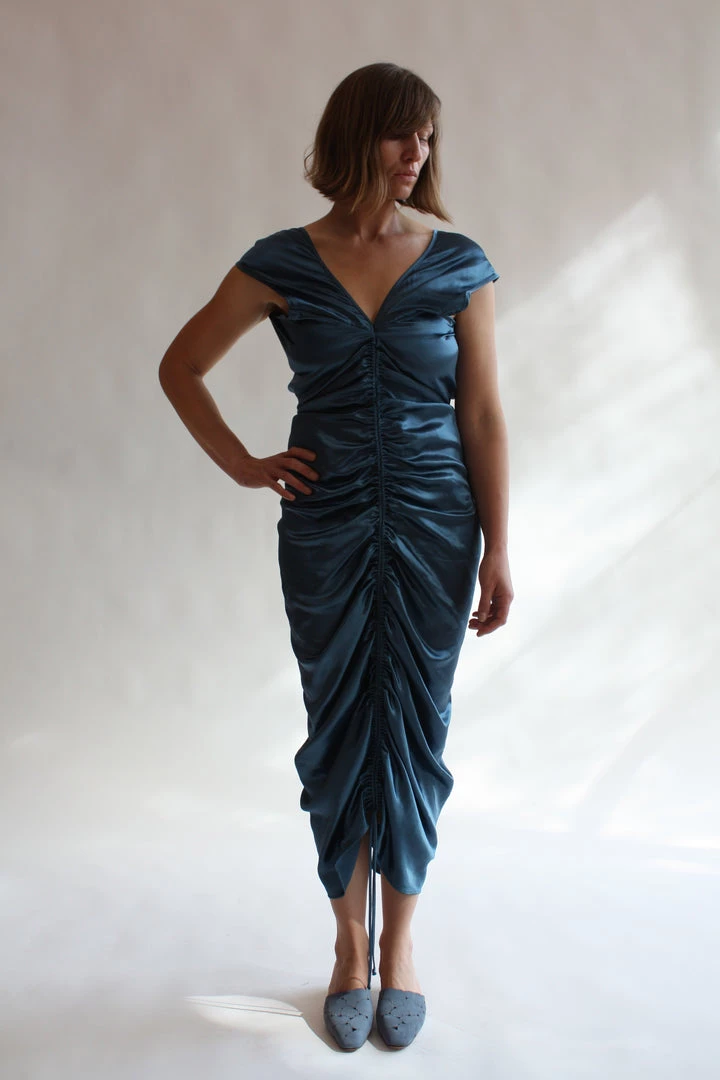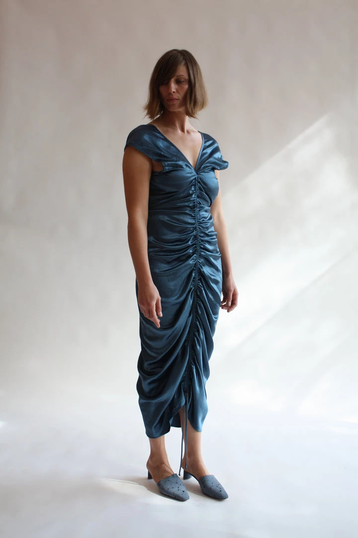 A beautifully draped mid-length dress. Featuring a fully adjustable drawcord that runs down the center front and an open tie back and center back zipper. Made in a luxe shiny satin acetate. Designed with intention to last for years to come, all seams are dually reinforced french seams.