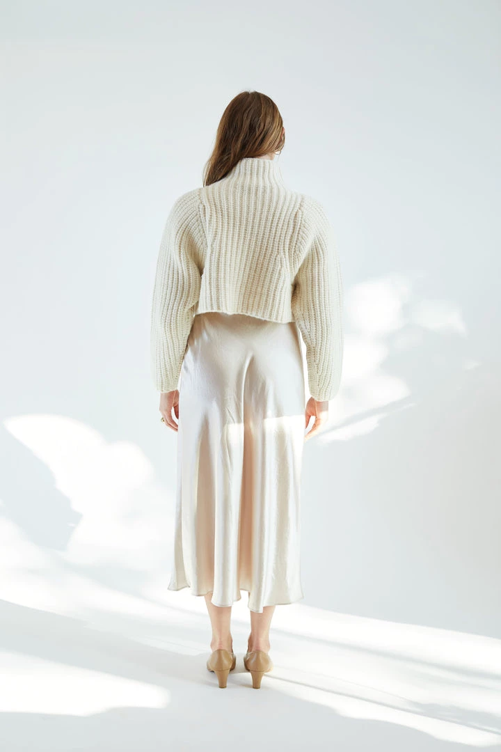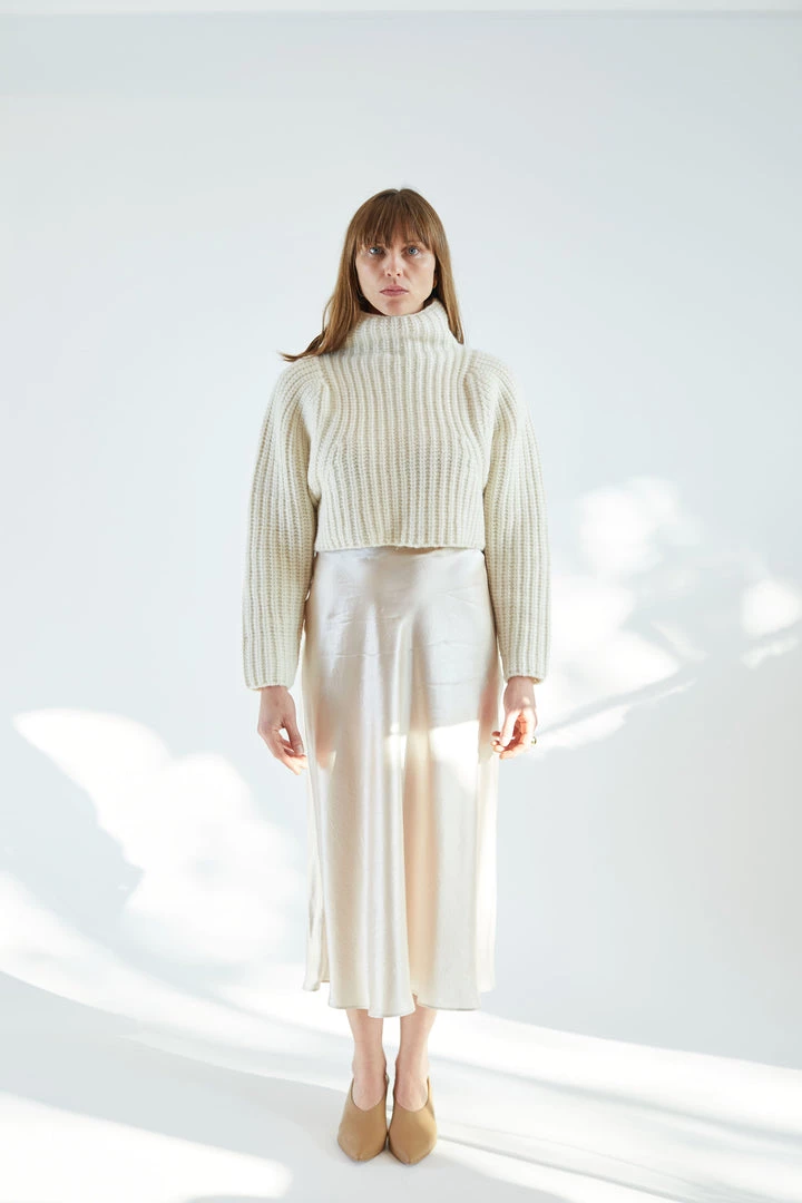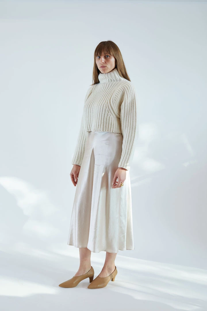 The Naropa Skirt is a bias cut slip style skirt in satin with size zip entry.