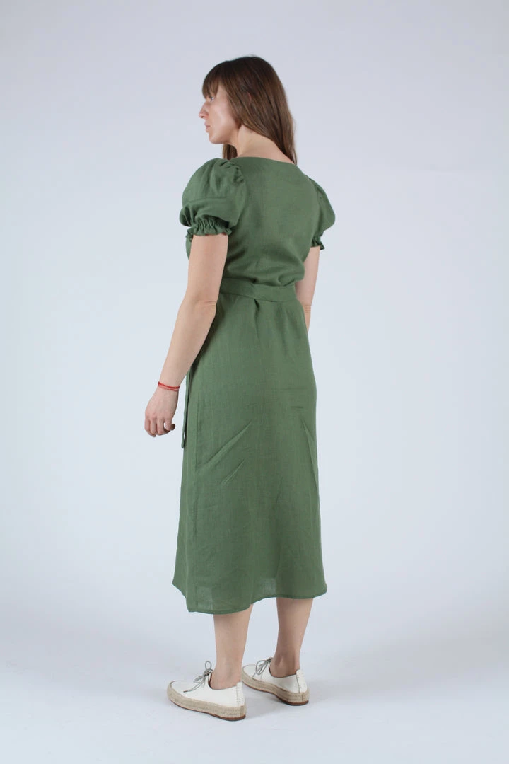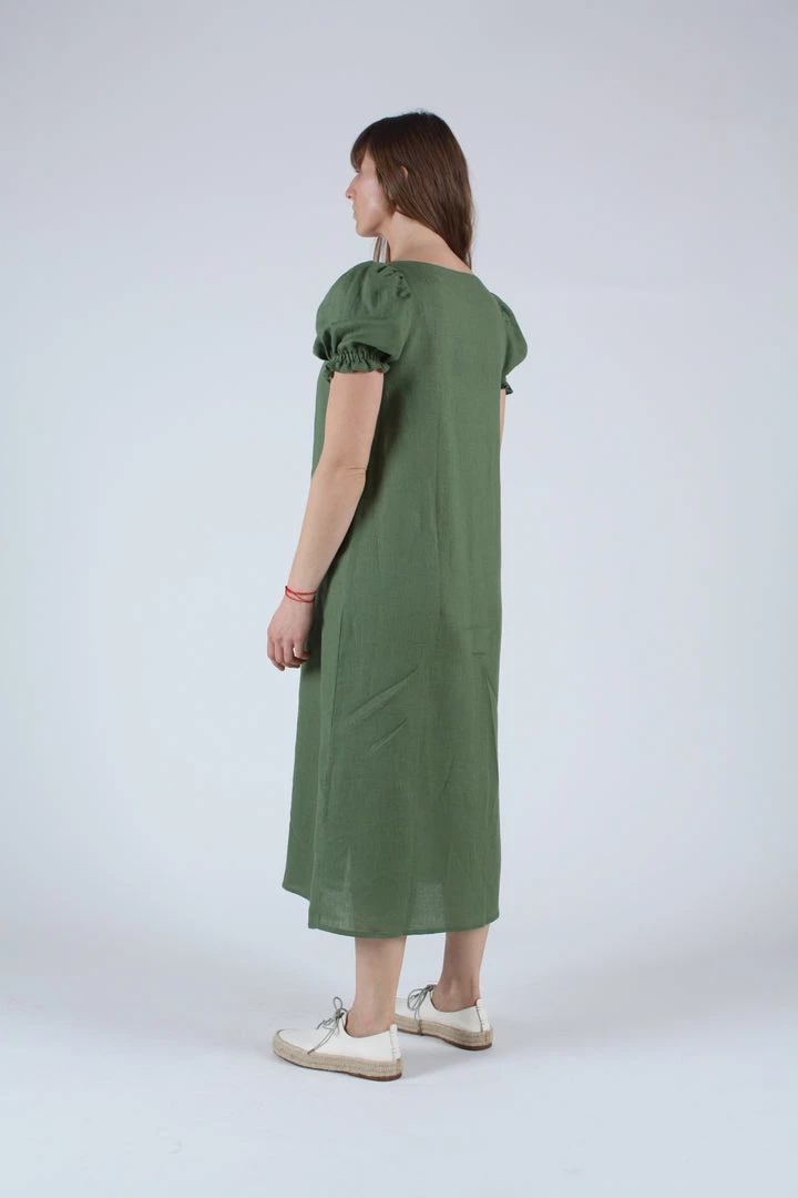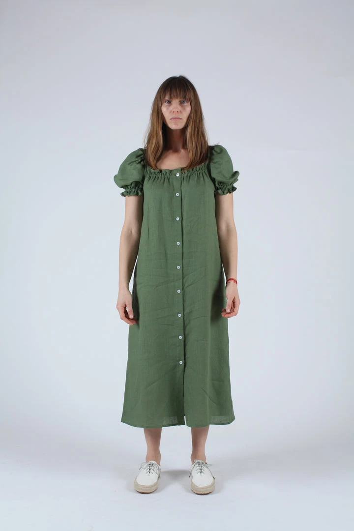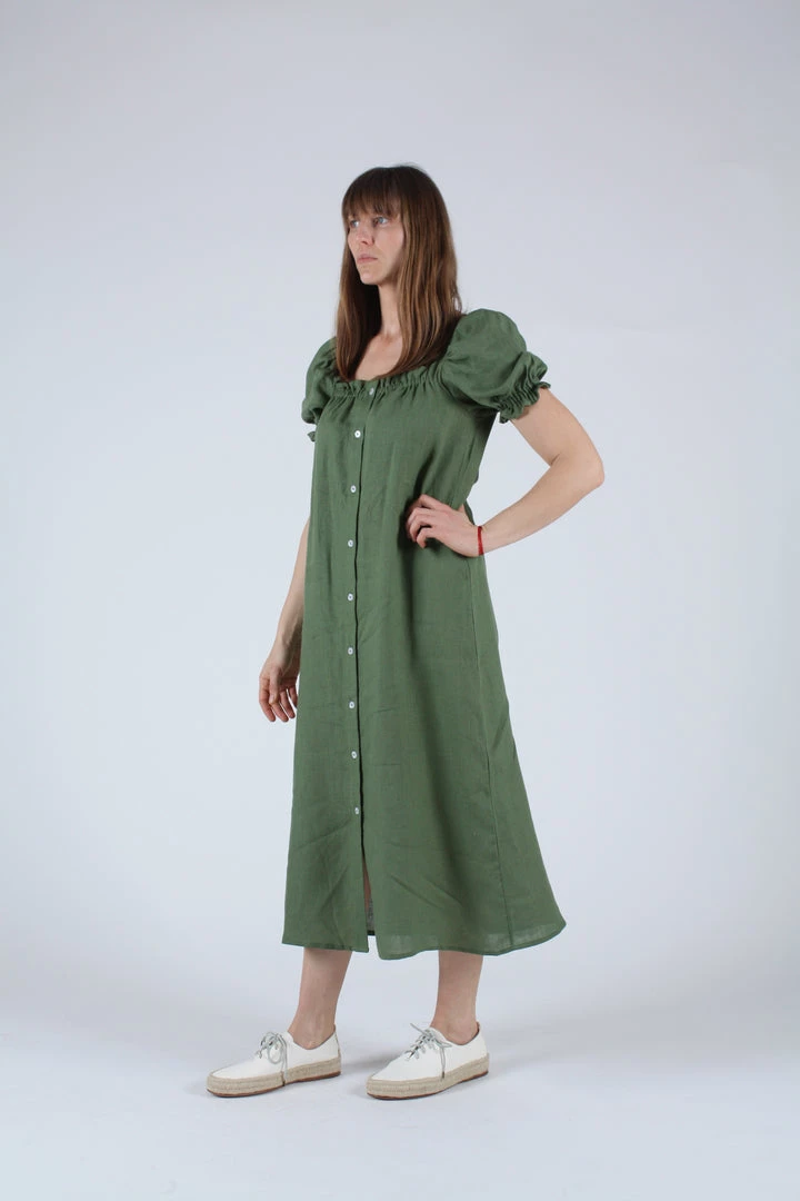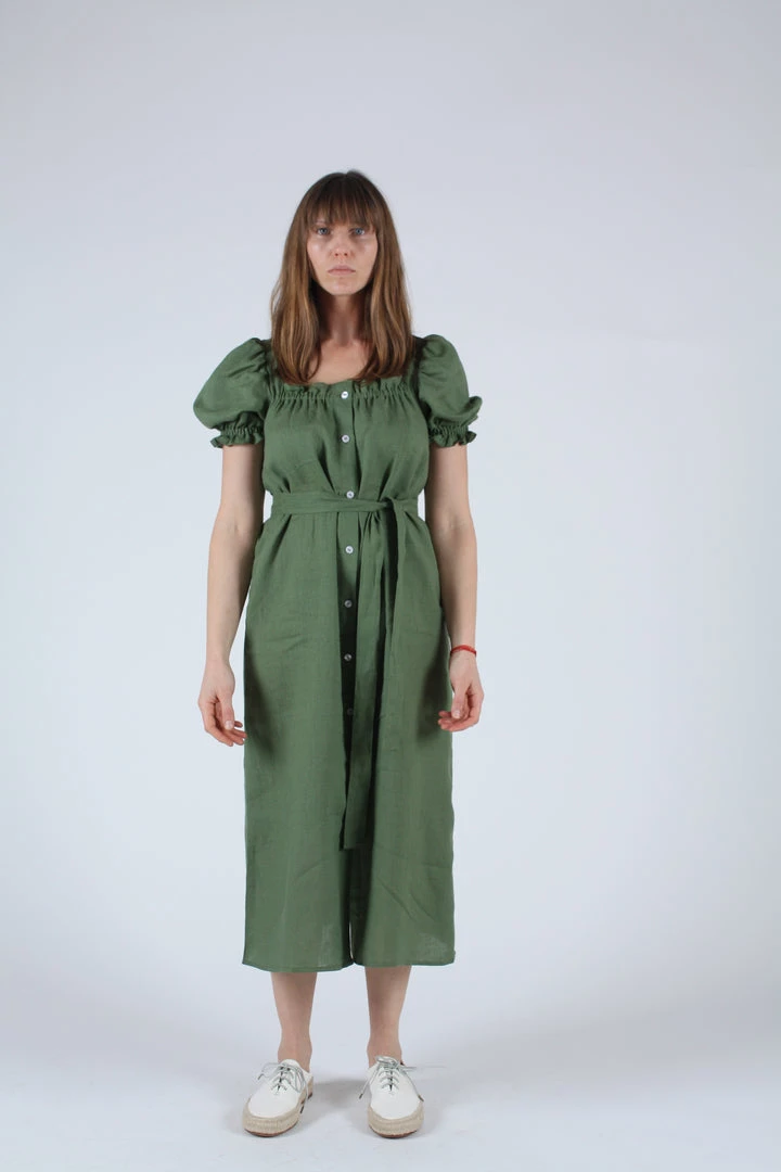 Shortsleeved easy button front lounge dress. Sleeves and square neckline are fixed with a soft elastic band.  Comes with a matching belt.