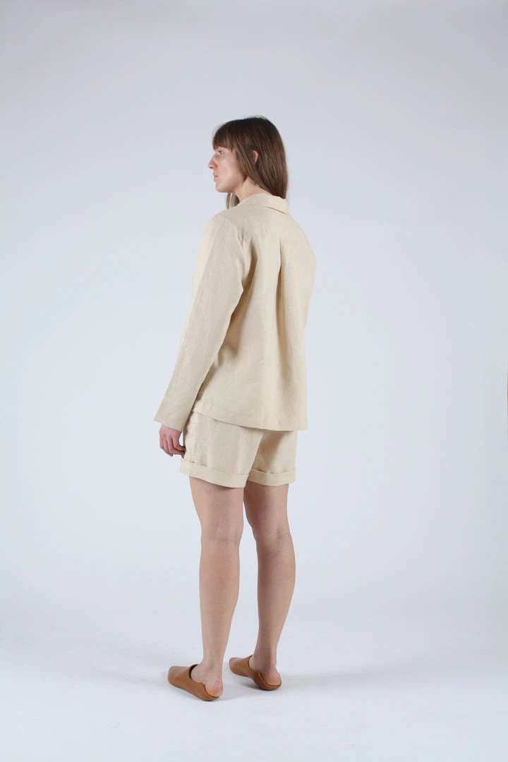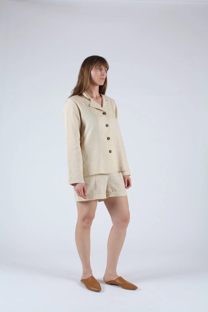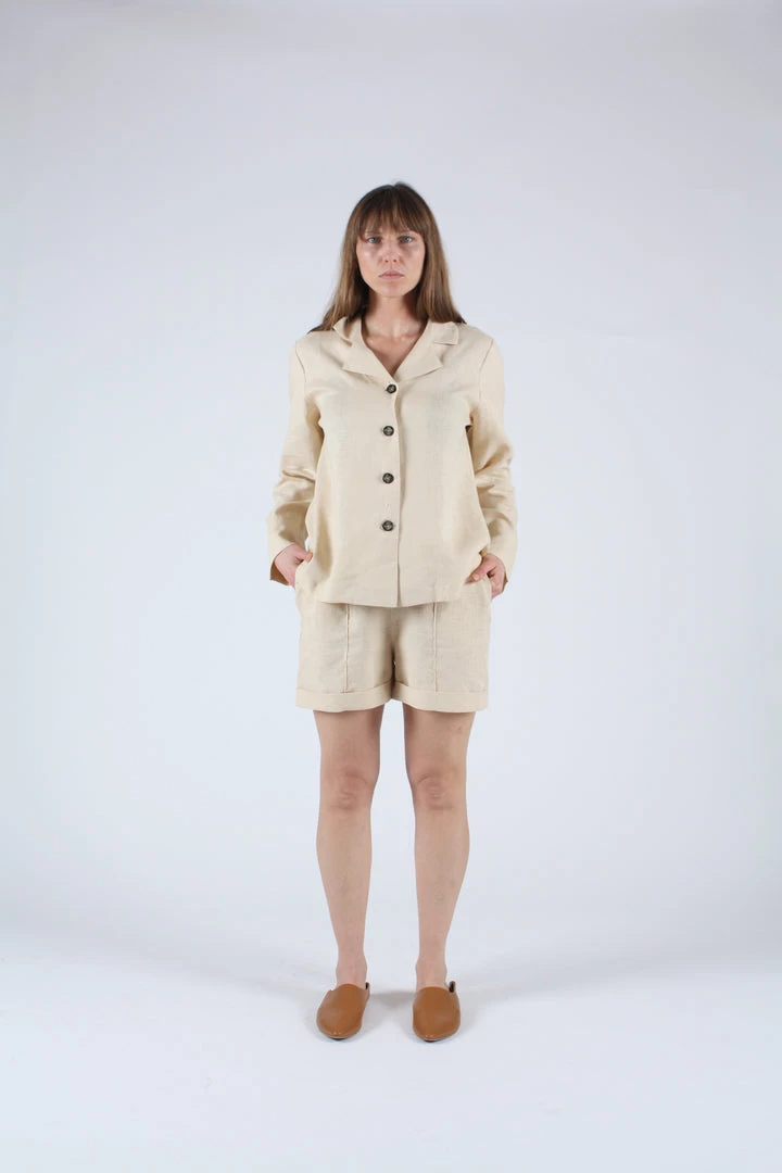 A feminine take on utilitarian classic menswear pajamas. Four-button notched collar top. Drawstring adjustable shorts with side pockets.