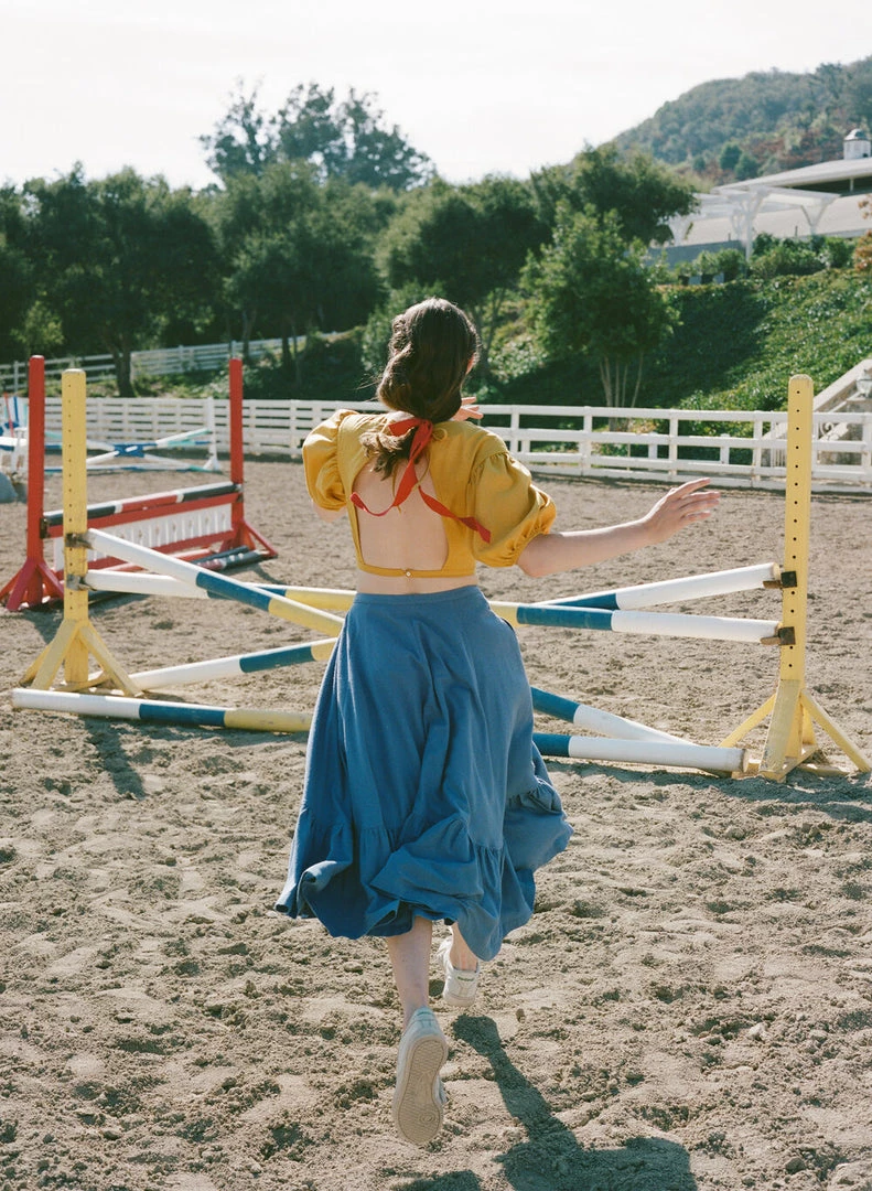 High waist, flared circle skirt with ruffled hem in sunflower yellow. Mother of pearl buttons along center front, inseam side pockets.