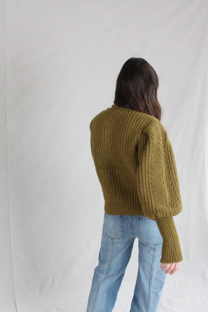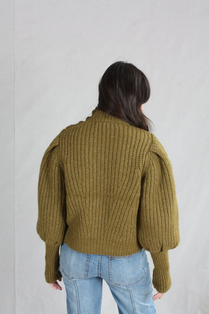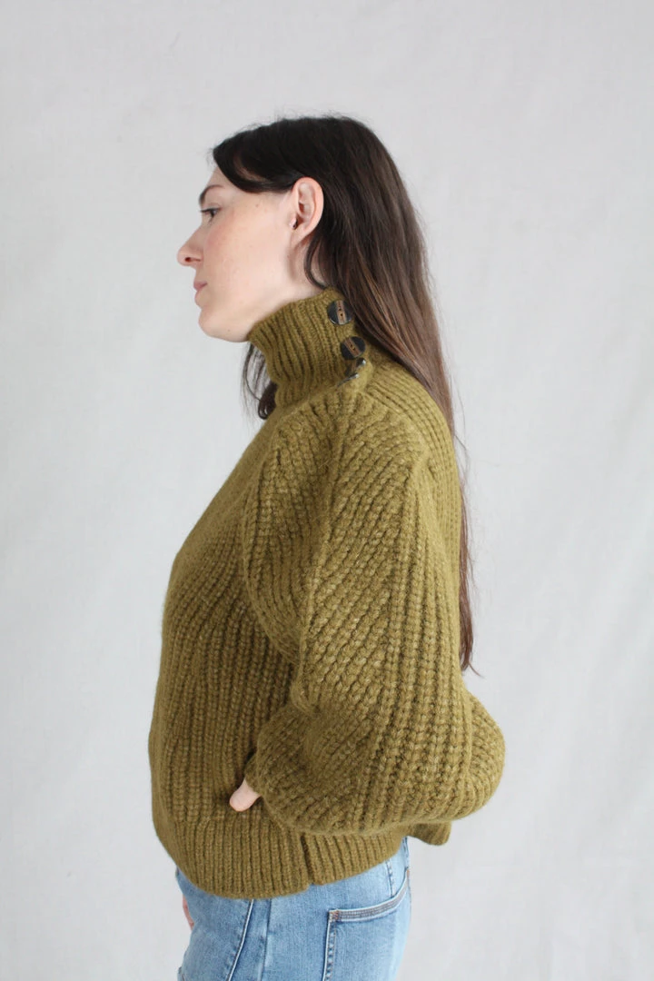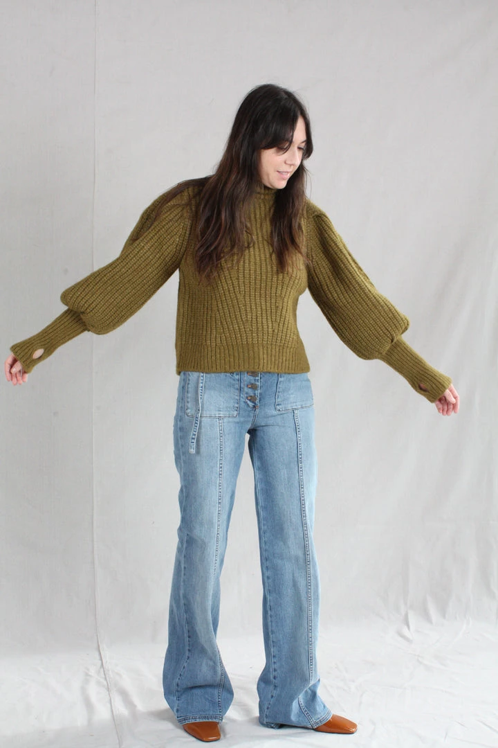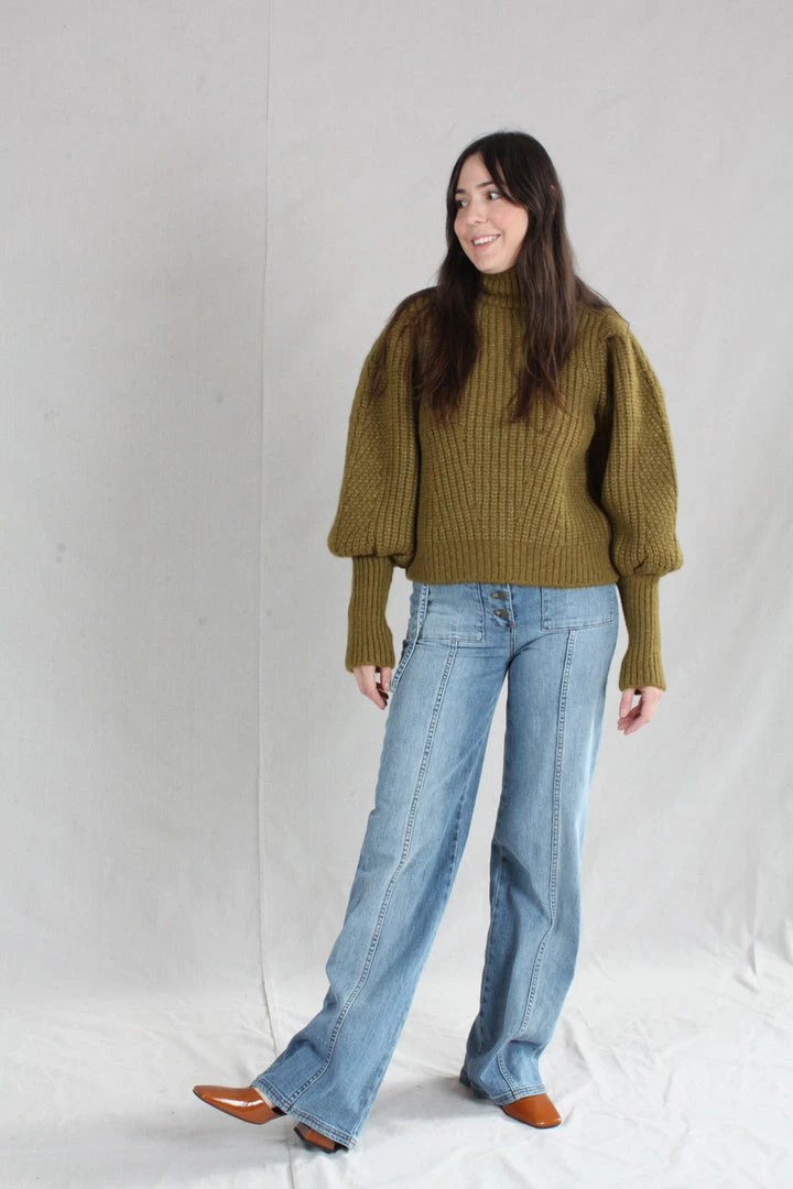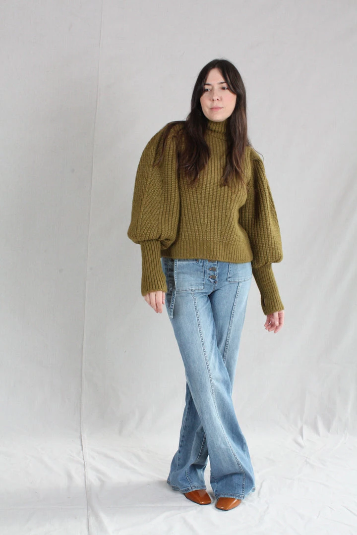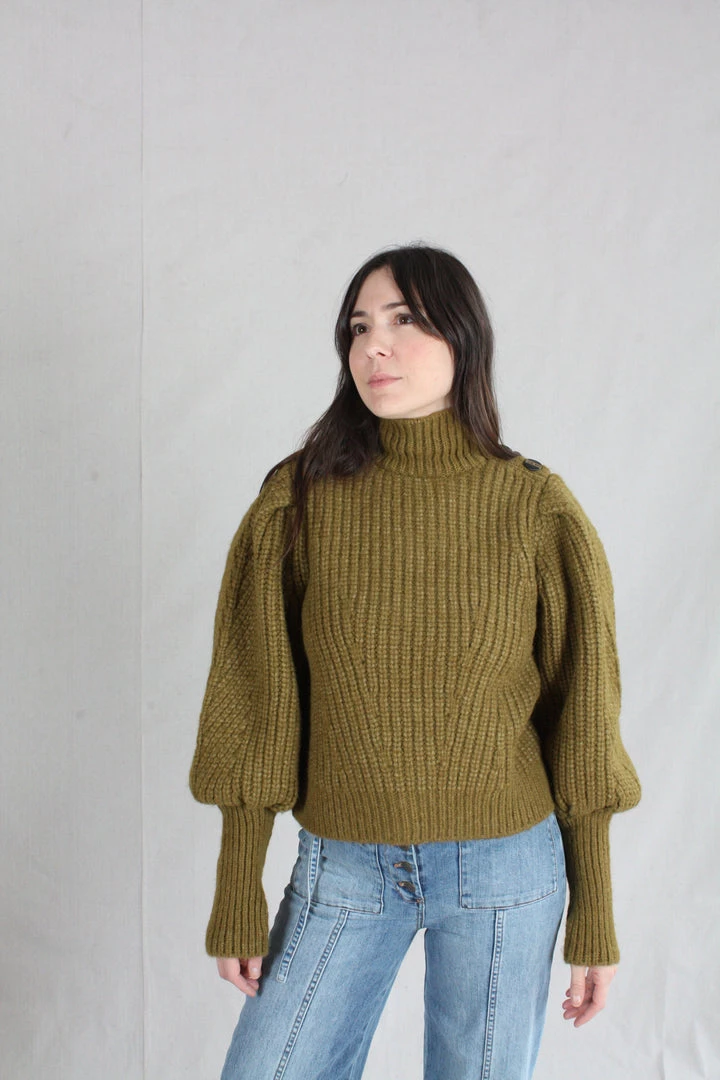 The Alana Pullover is knitted in a lofty alpaca wool, in a deep shade of Tapenade. Features billowing sleeves with a slim, elongated cuff and a high turtleneck.