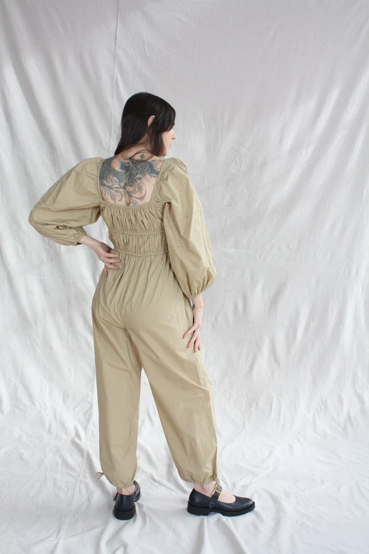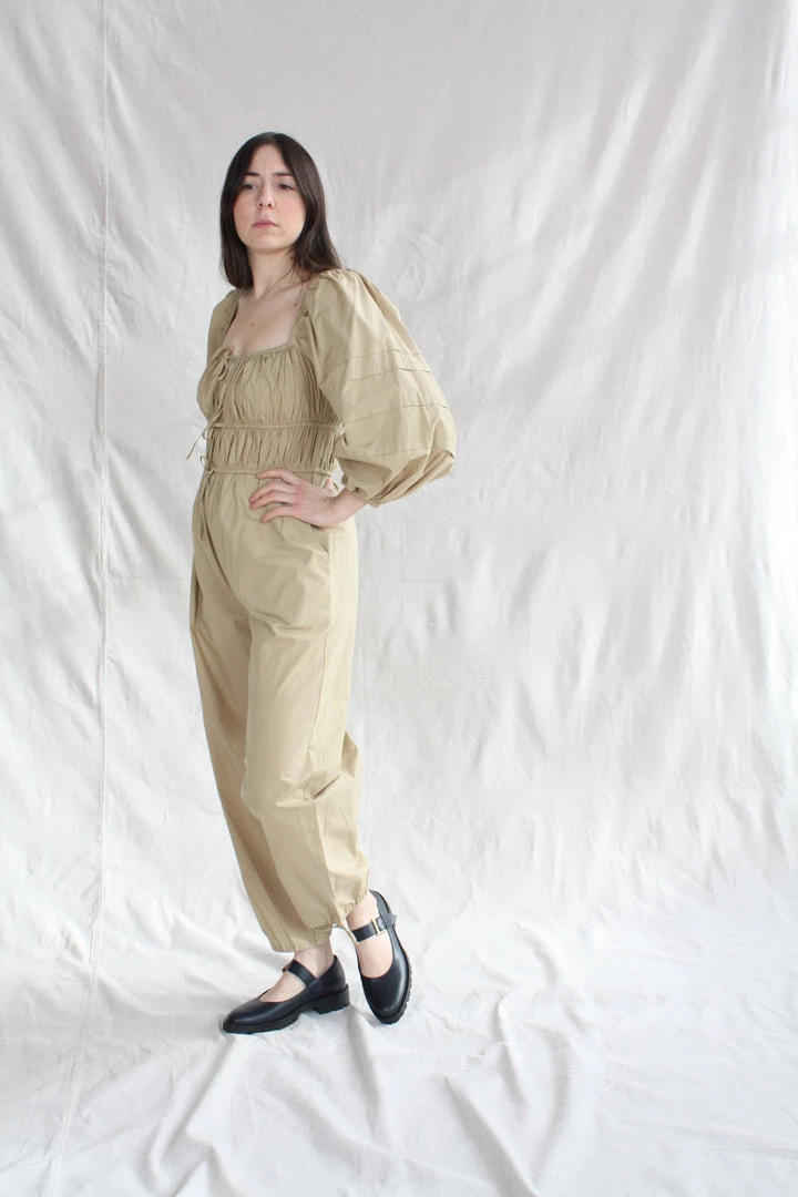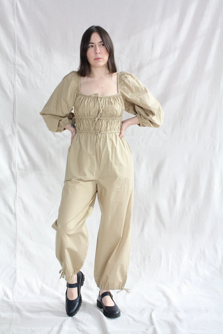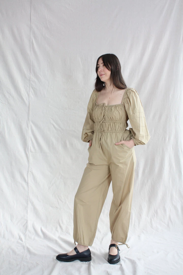 The Amalie Jumpsuit with puff sleeves and signature pin-thin drawstring ties creating a flattering smocked bodice and tapered leg. This wear-everywhere jumpsuit is designed with both comfort and sense of ease in mind.