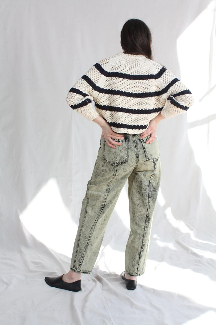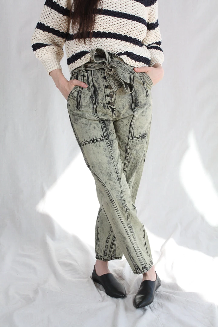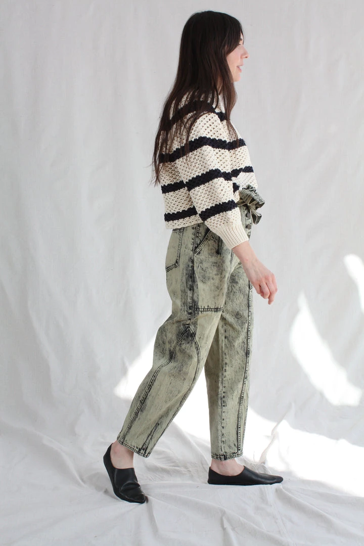 The Brier Jean in a pale mint acid wash denim is a familiar shape, with an Ulla Johnson signature tapered leg and belted high-waist.