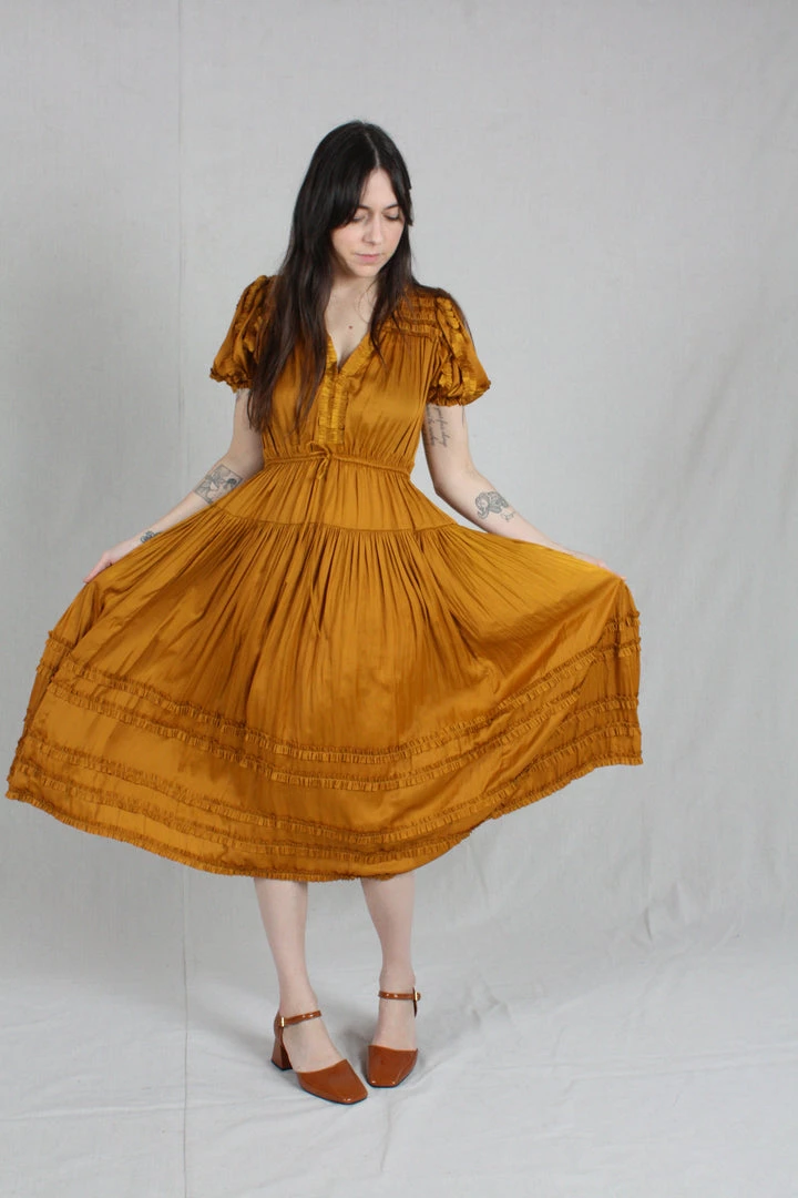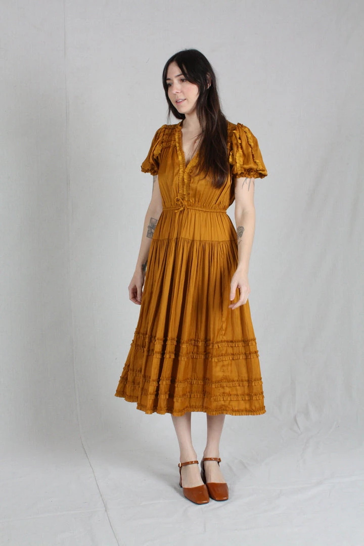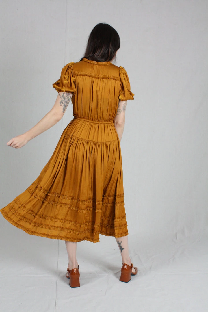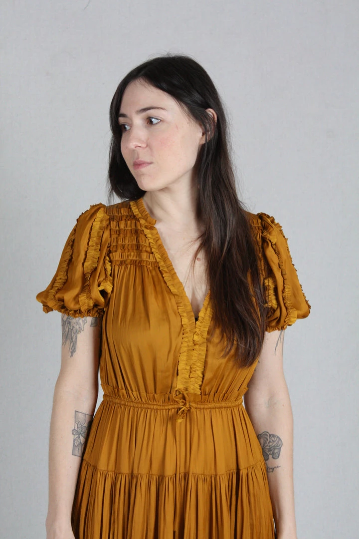 The Rose Dress is crafted in UJ’s seasonless plisse satin in Goldenrod. A plunging neckline is framed with double-edged ruffles, which enhance the dress throughout. Features a signature silhouette of puff sleeves finished with an elastic cuff, midi-length skirt and a side zip closure. This dress is unlined.