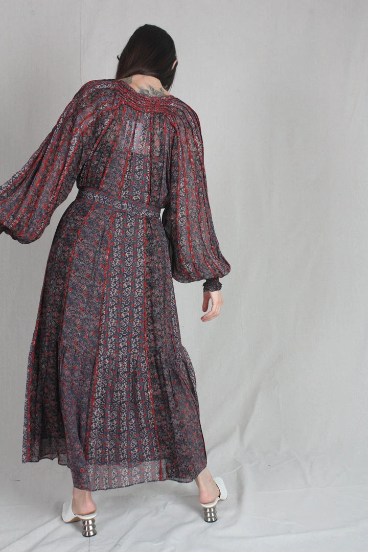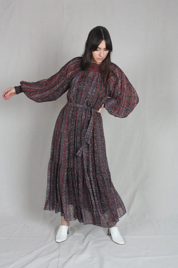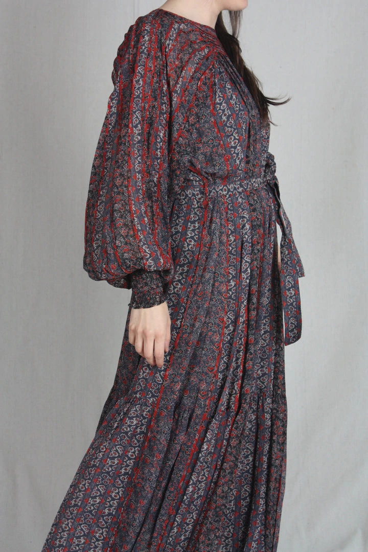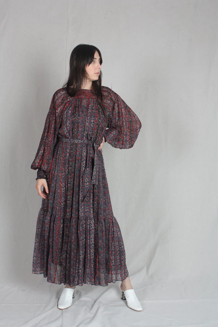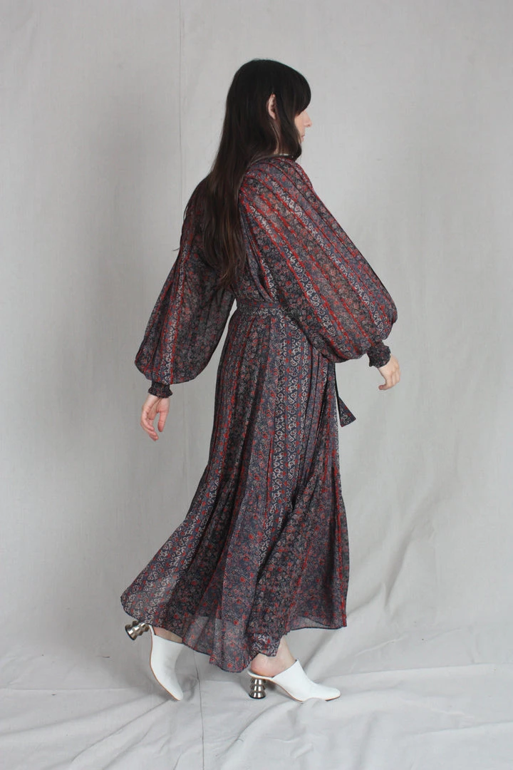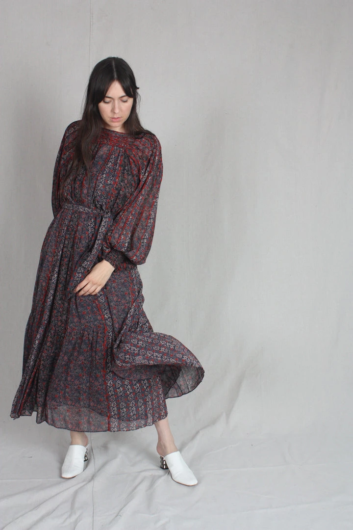 The Xenia Dress is crafted in Ulla Johnson’s signature printed silk-georgette, in three stunning artworks patchworked together. Contrast piping adds dimension, creating vertical lines that are both exposed and hidden with movement. Blouson sleeves and bateau neckline add simple elevation in this ankle-grazing silhouette. This dress is lined.