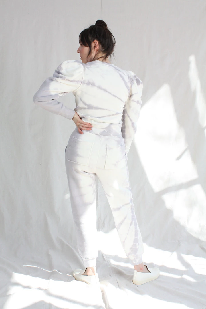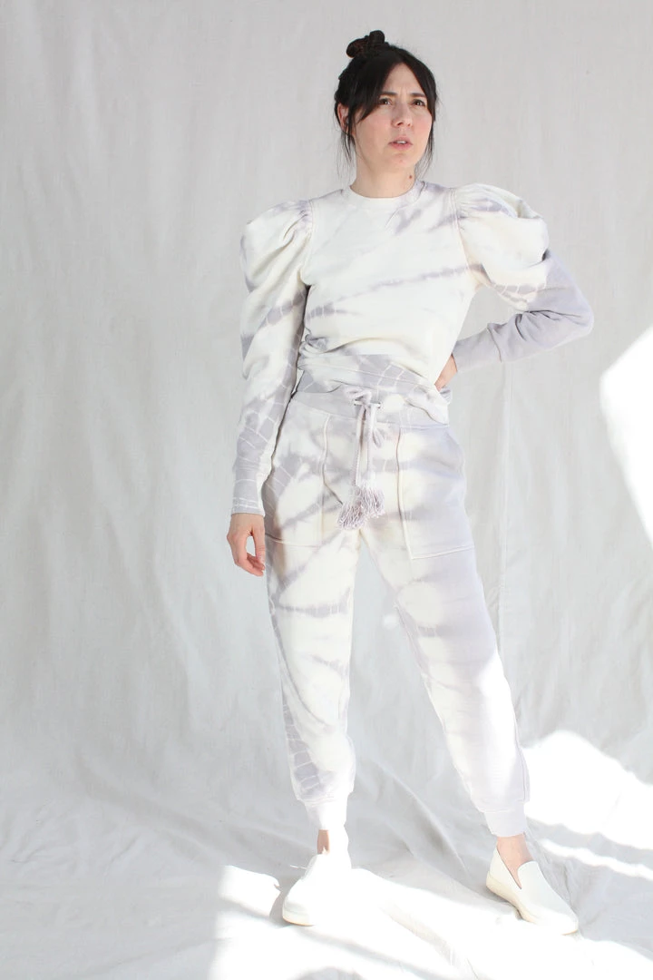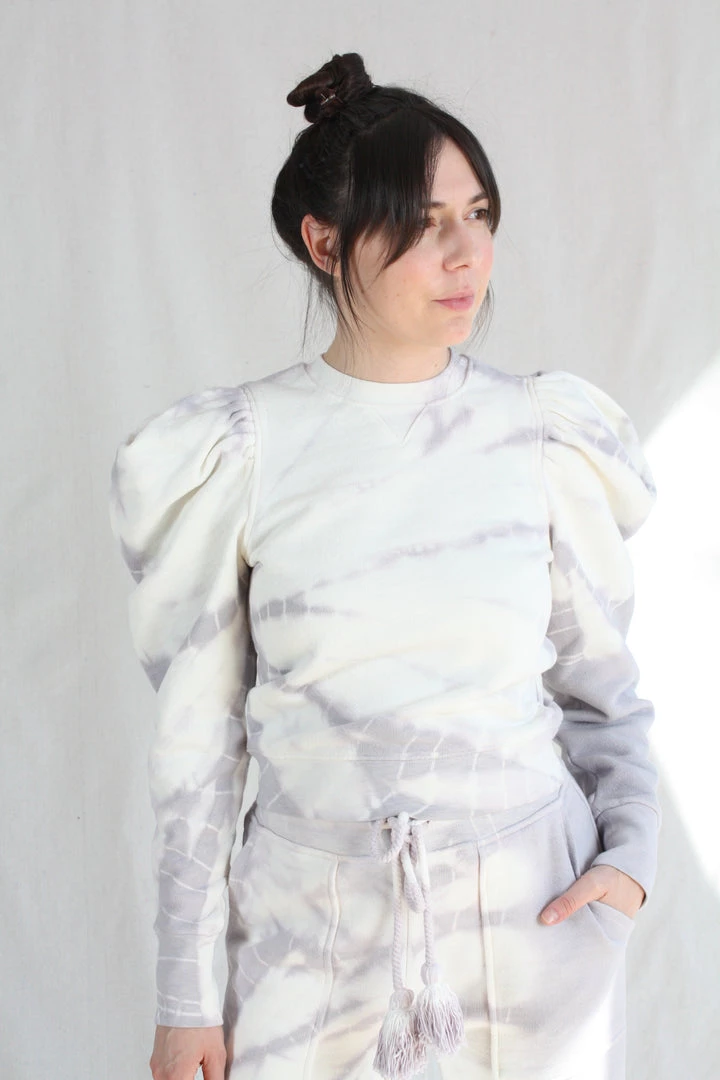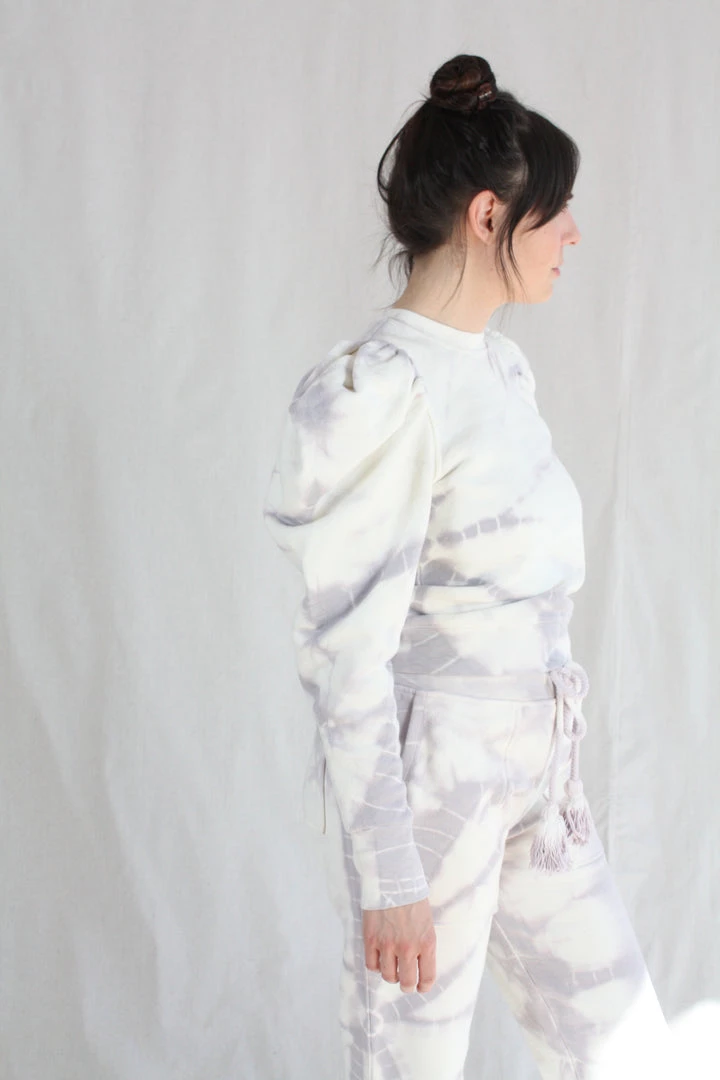 The Harlan Pullover is cut in lilac tie dye cotton fleece with draped sleeves that are gathered along the shoulder seam.