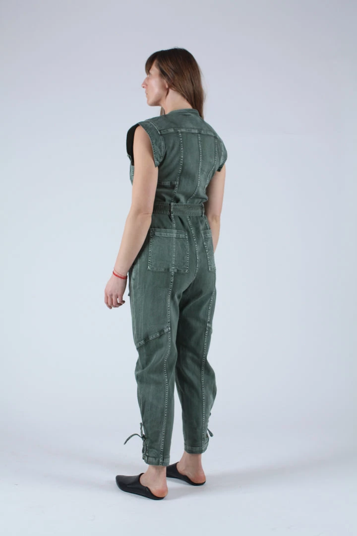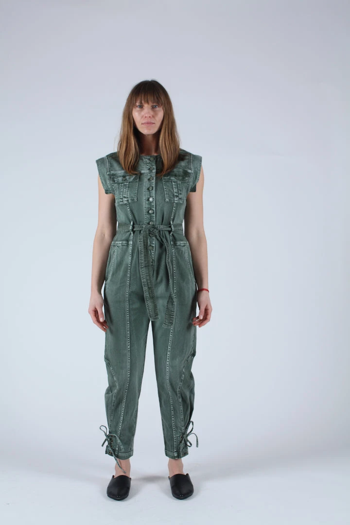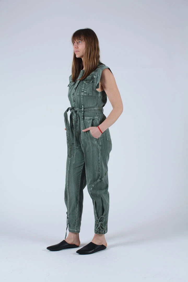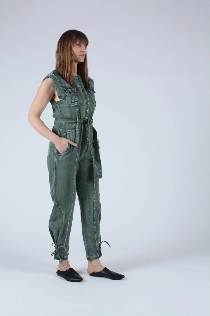 Utilitarian style jumpsuit adorned with feminine details, featuring a removable waist belt, corset style cuffs, and front bodice button closure.