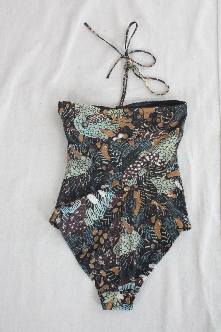 The Minorca Maillot patterned in a beautiful floral print in shades of marigold, burgundy and pale blue. This suit features a halter strap and flattering double keyhole with ruching detail adding a bit of texture.