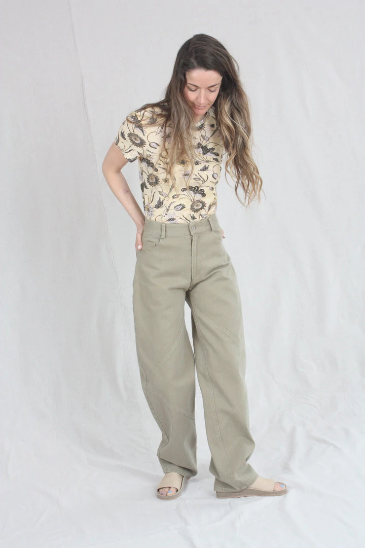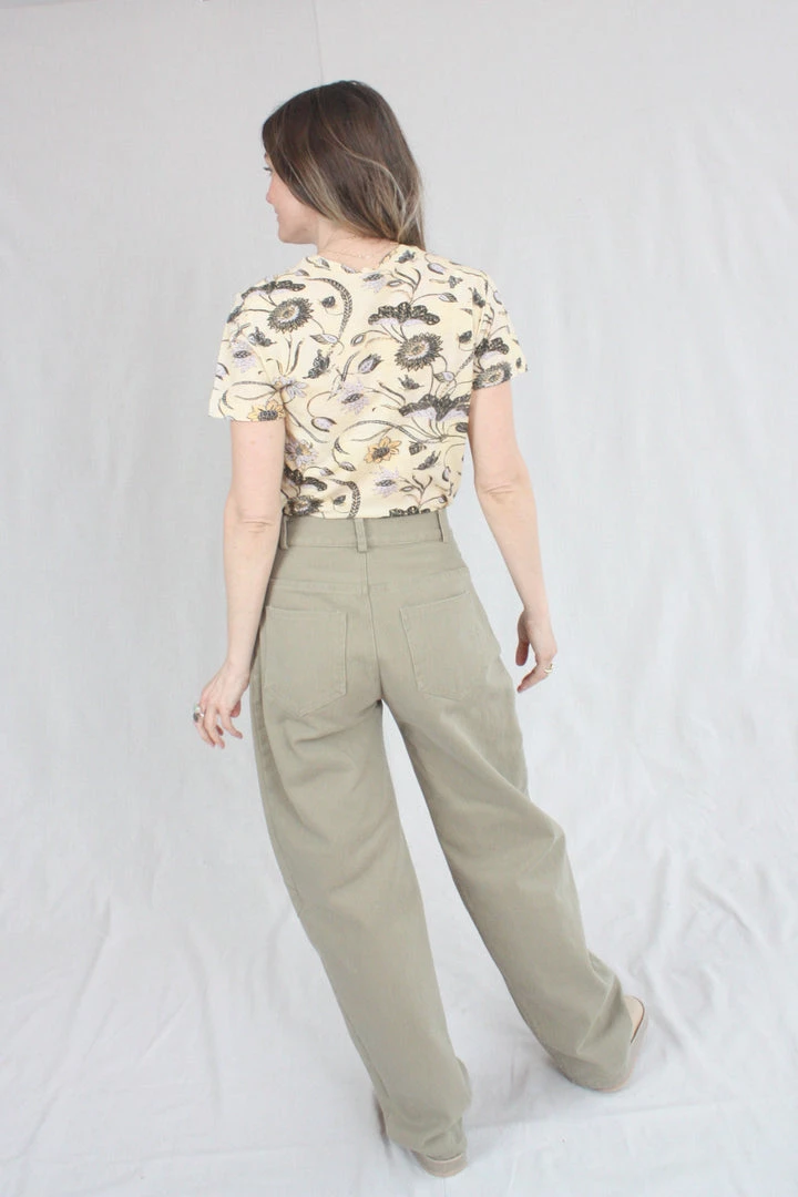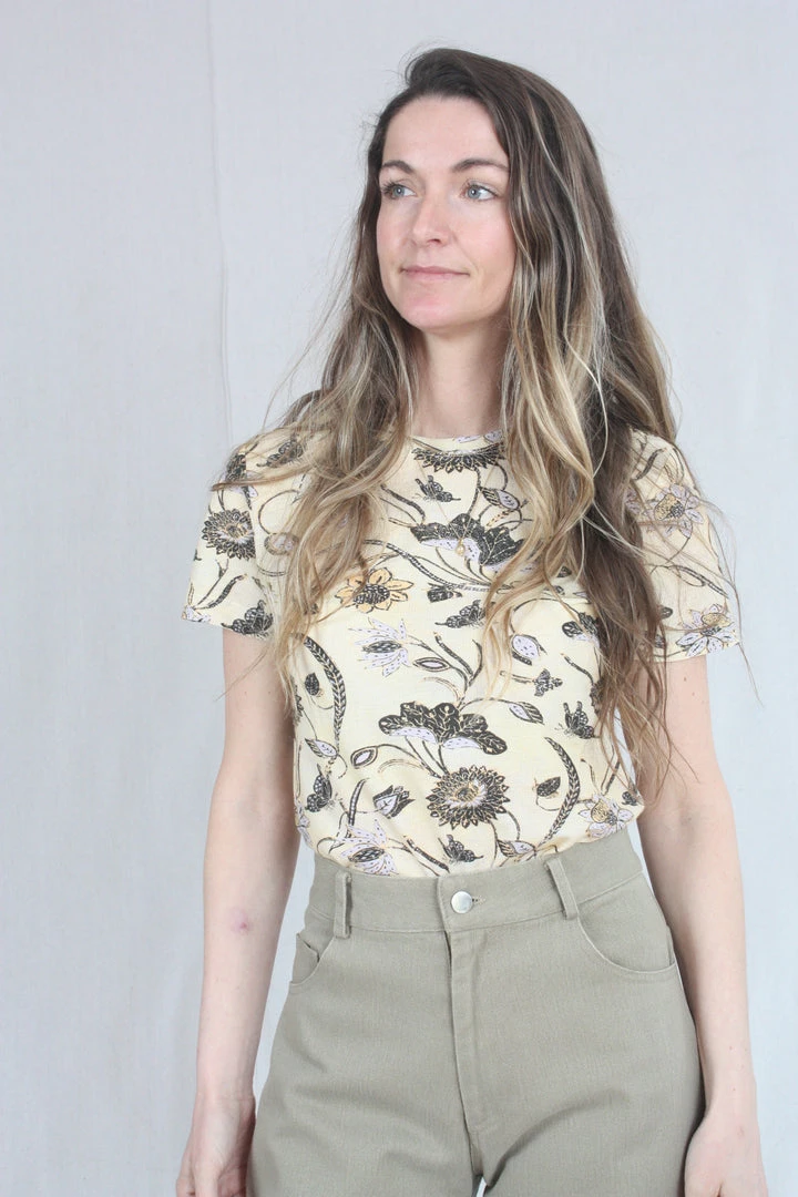 The Estelle T-Shirt is cut in soft cotton fabric and patterned in lemonbalm. This short sleeve top is meant to fit close to the body, designed with a simple crewneck and fitted sleeves.
