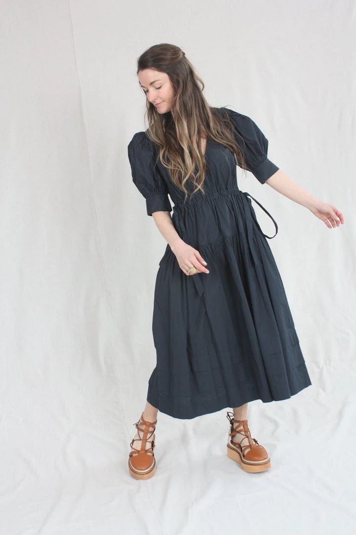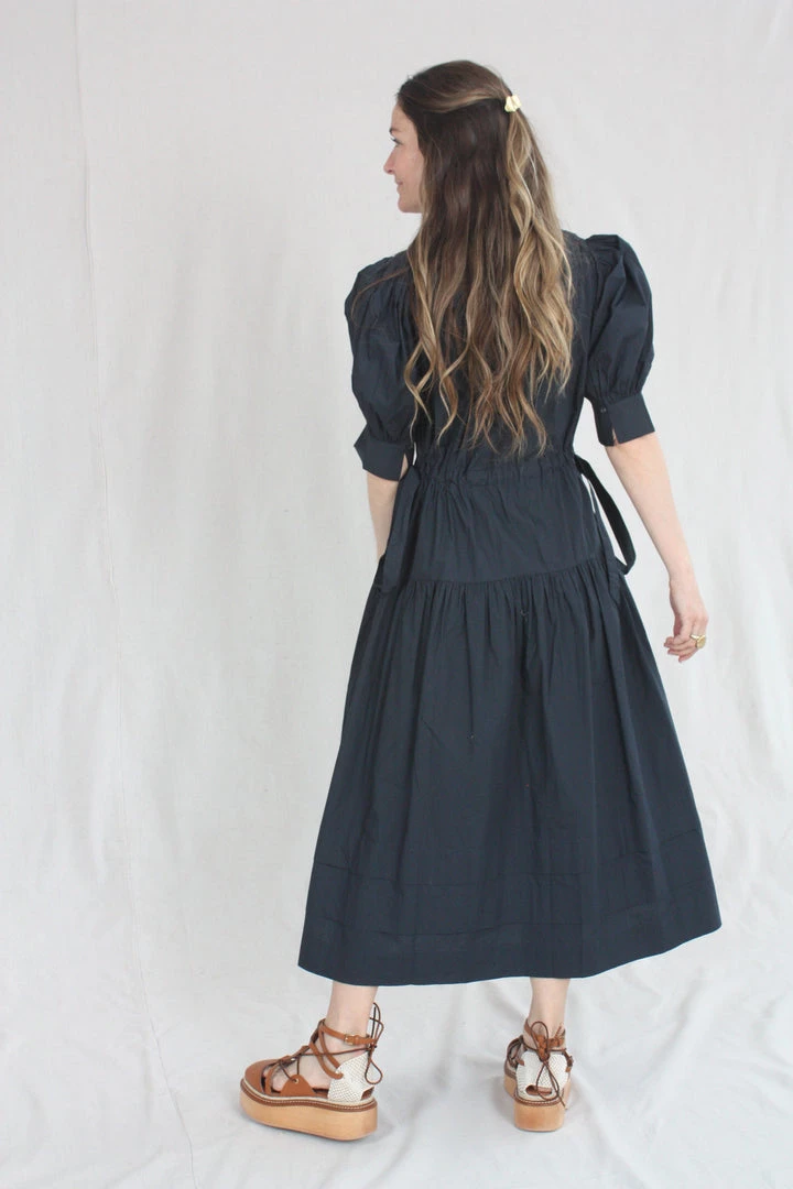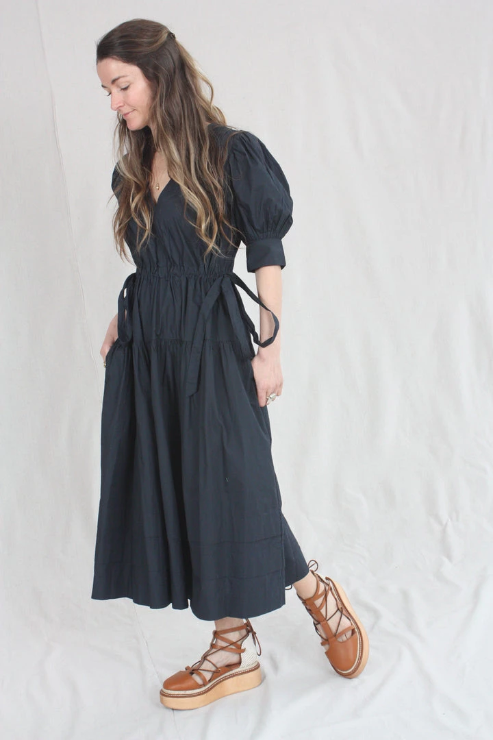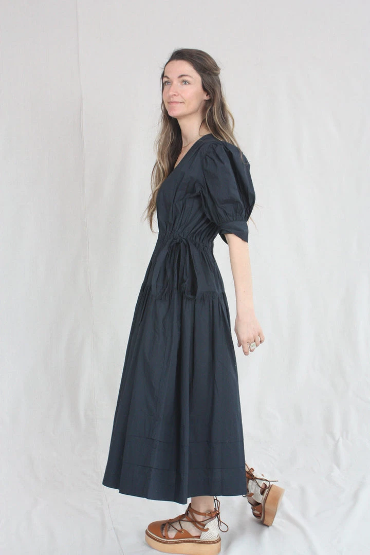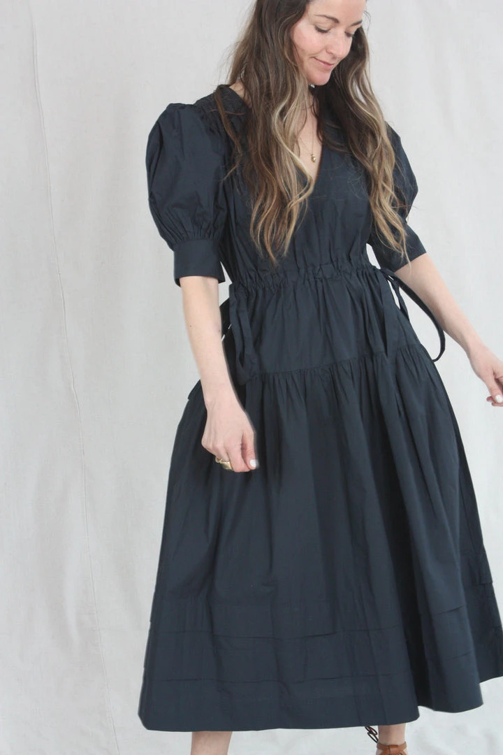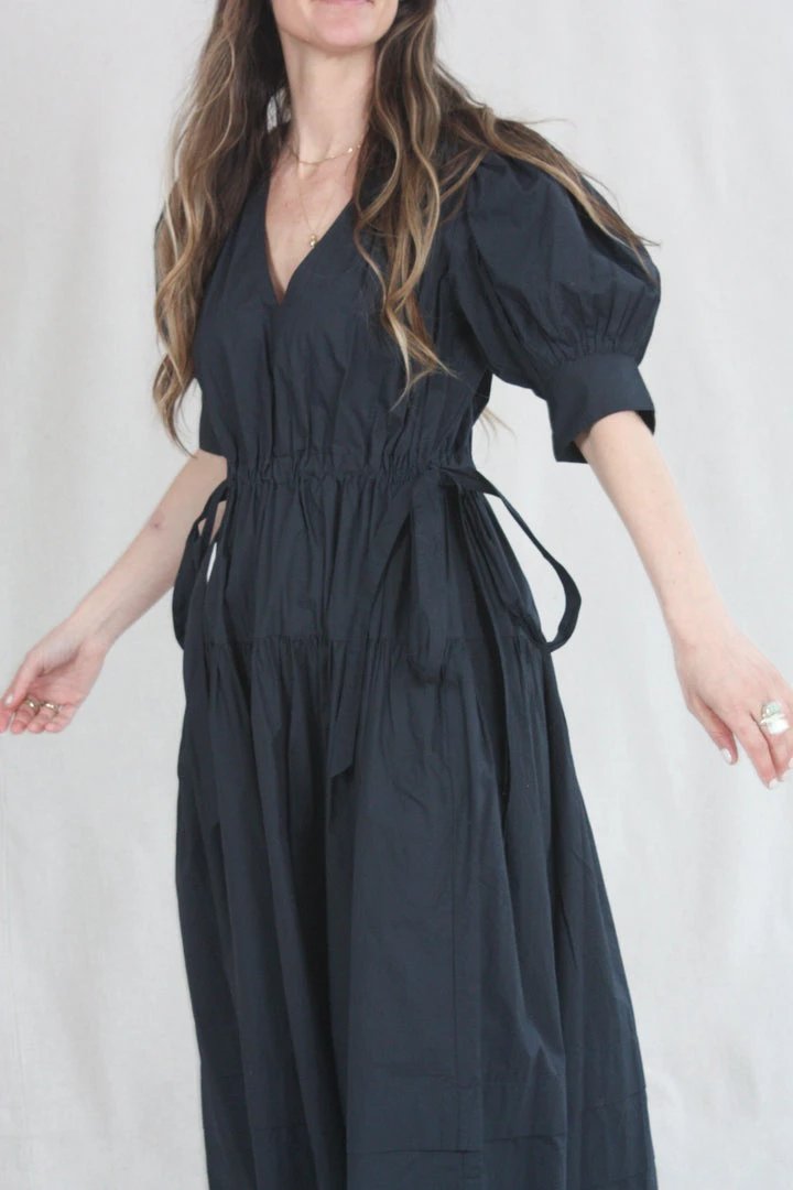 The Imani Dress is a midi-length silhouette with signature puff sleeves and an open deep v-neckline. Ruching along the bodice is mimicked in the midi-length skirt, which is finished with drawstring bows at each side of the waist.