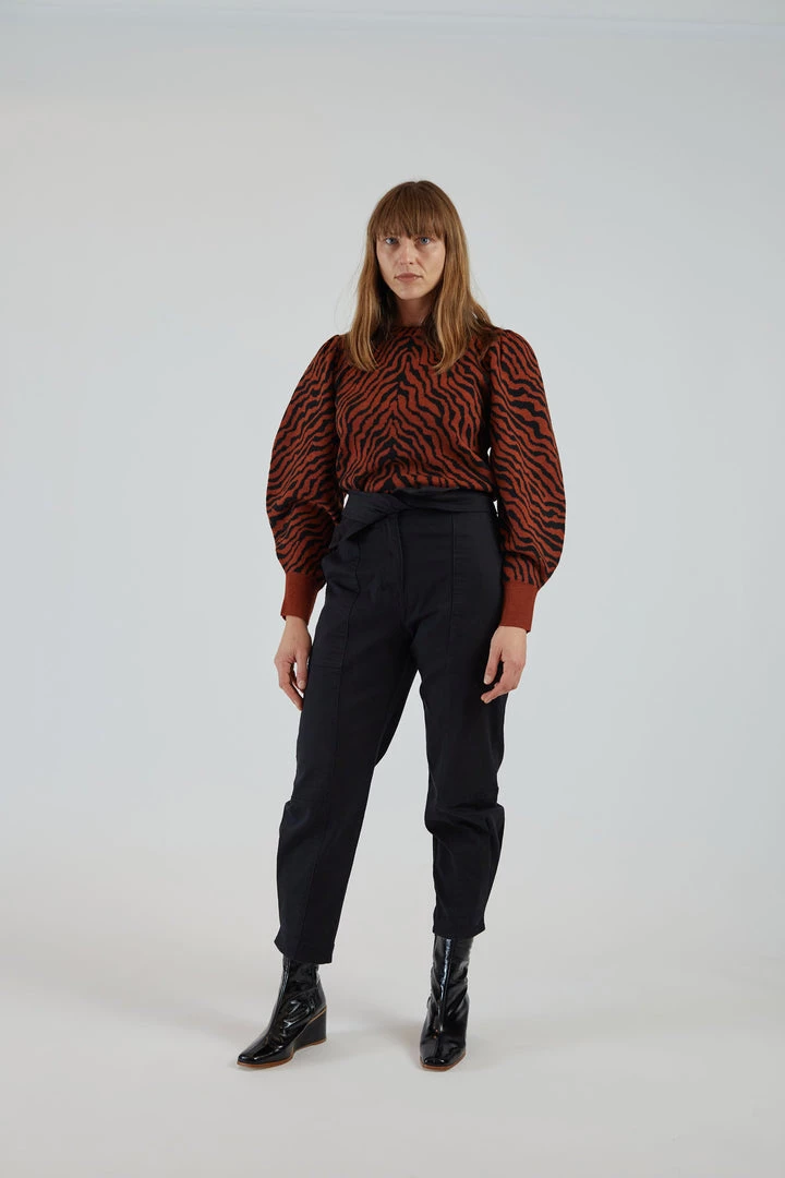 The Storm Jean in ultra rich Noir, ankle length style featuring tonal stitching, high belted waist, tapered peg cuff, and enamel button closure.